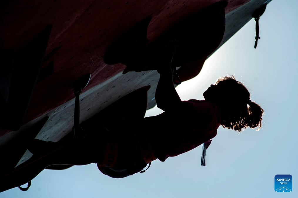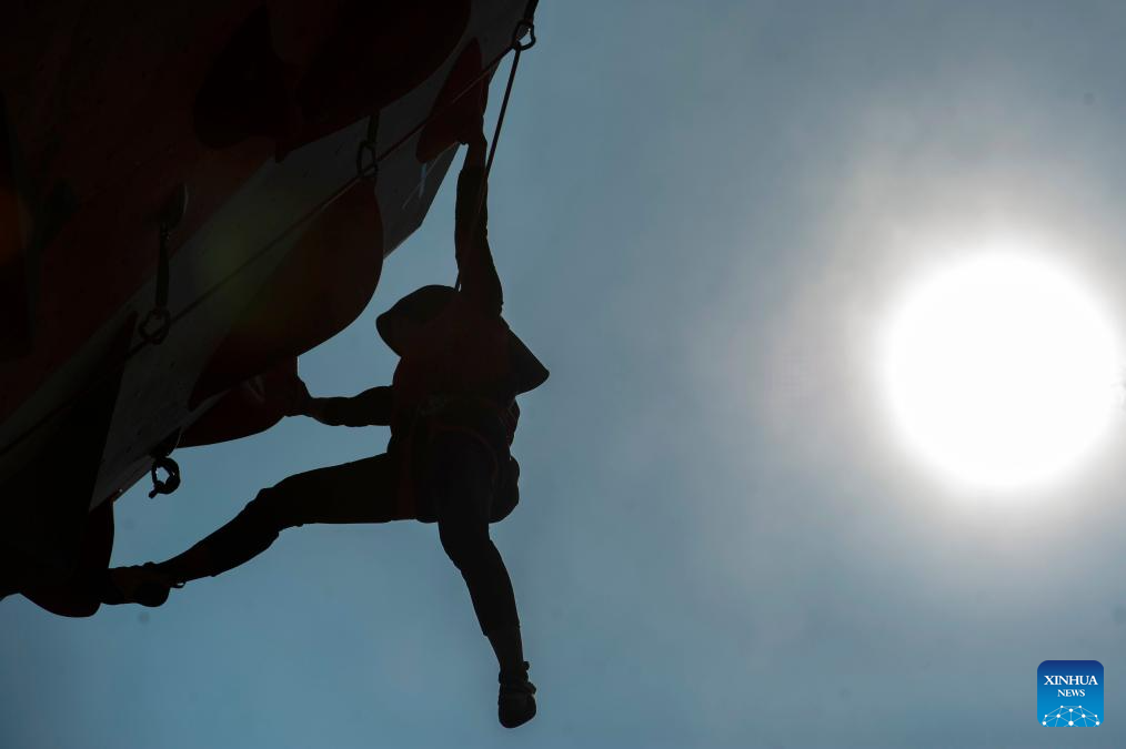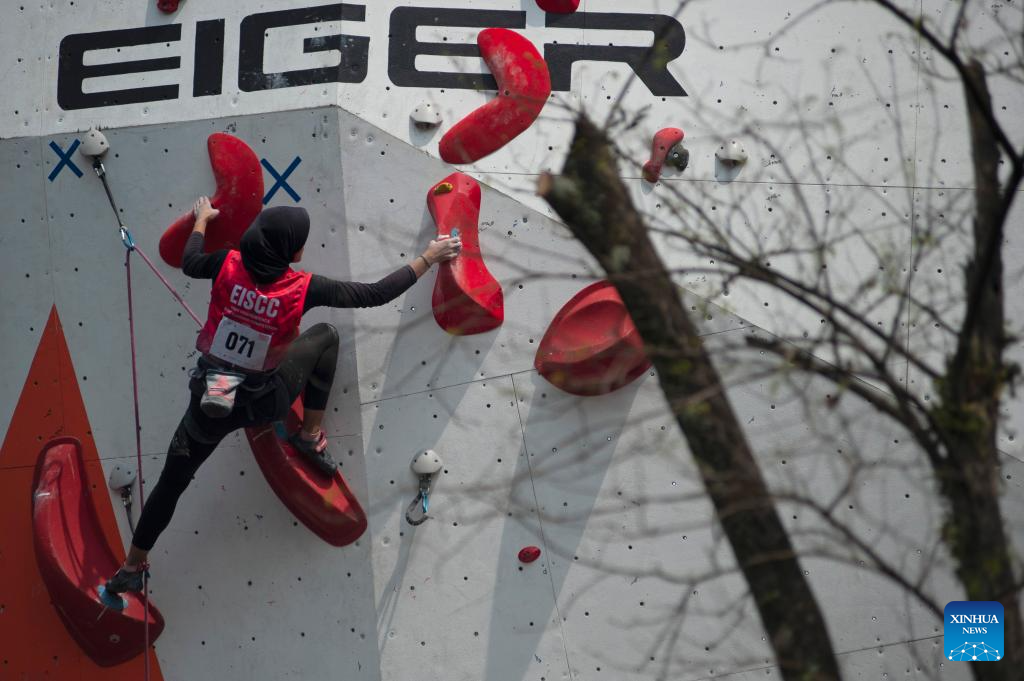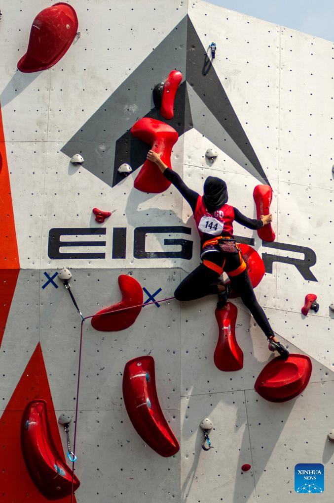 Widia Fujiyanti of Indonesia competes during the women's lead semifinal during Eiger Independence Sport Climbing Competition (EISCC) 2024 in Bandung, West Java, Indonesia, Aug. 16, 2024. (Photo by Septianjar Muharam/Xinhua)
