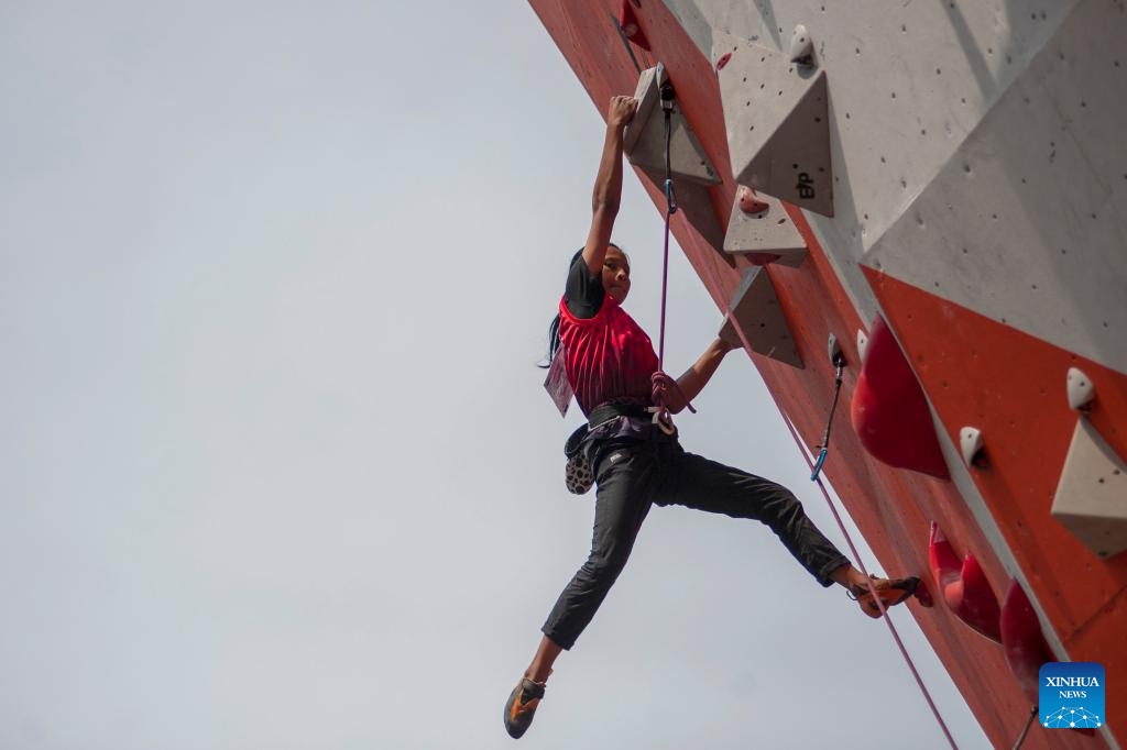Najiha Zahra of Indonesia competes during the women's lead semifinal during Eiger Independence Sport Climbing Competition (EISCC) 2024 in Bandung, West Java, Indonesia, Aug. 16, 2024. (Photo by Septianjar Muharam/Xinhua)