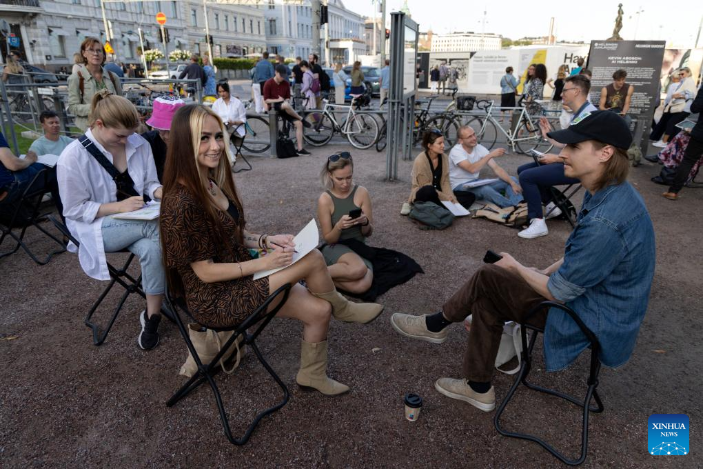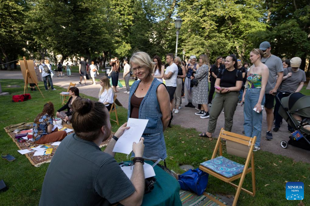 People participate in a poem activity at an art workshop in the city center of Helsinki, Finland, on Aug. 15, 2024. The Night of the Arts took place on August 15th in Helsinki, celebrating its 35th anniversary this year. (Photo by Matti Matikainen/Xinhua)