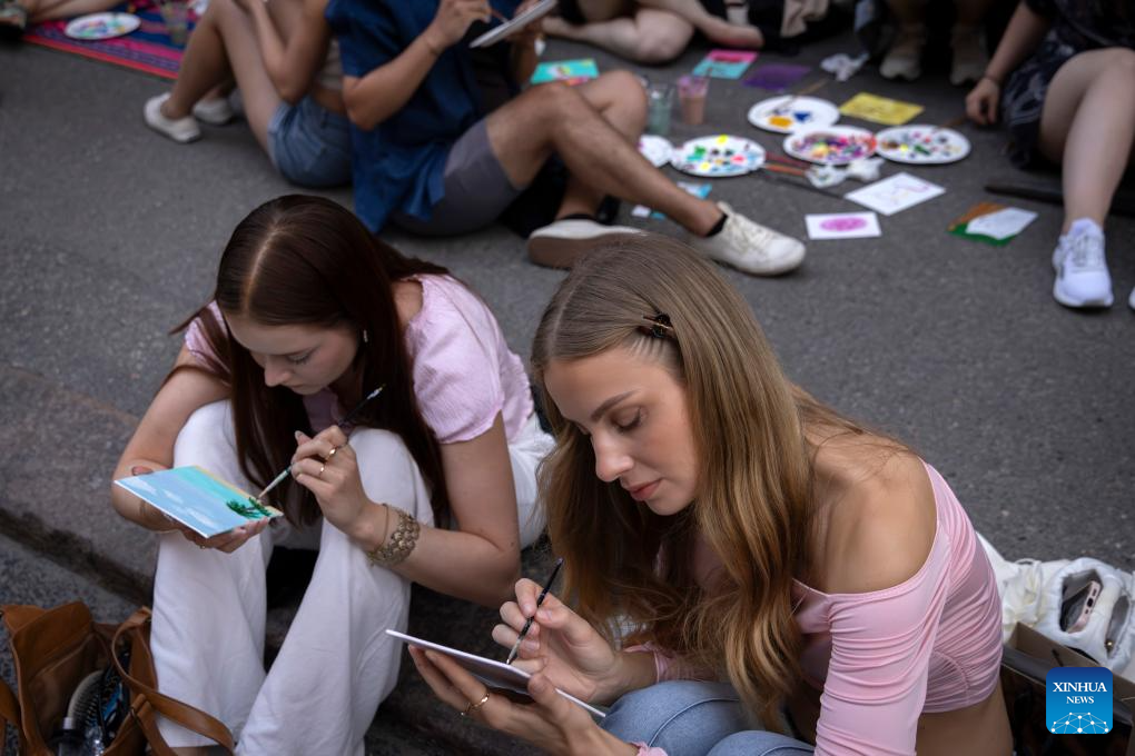 People participate in a painting activity at an art workshop during the Night of the Arts in Helsinki, Finland on Aug. 15, 2024. The Night of the Arts took place on August 15th in Helsinki, celebrating its 35th anniversary this year. (Photo by Matti Matikainen/Xinhua)