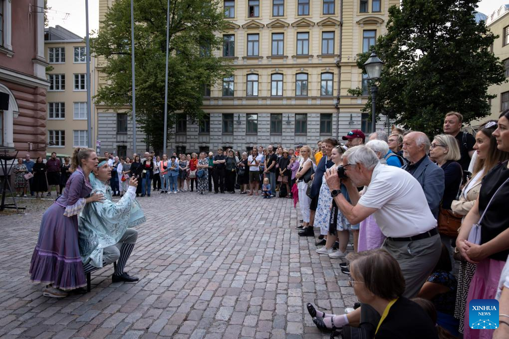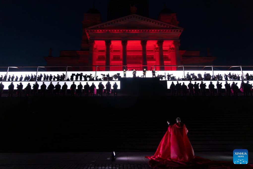 People watch opera performance at the main entrance of Alexander Theatre during the Night of the Arts in Helsinki, Finland on Aug. 15, 2024. The Night of the Arts took place on August 15th in Helsinki, celebrating its 35th anniversary this year. (Photo by Matti Matikainen/Xinhua)