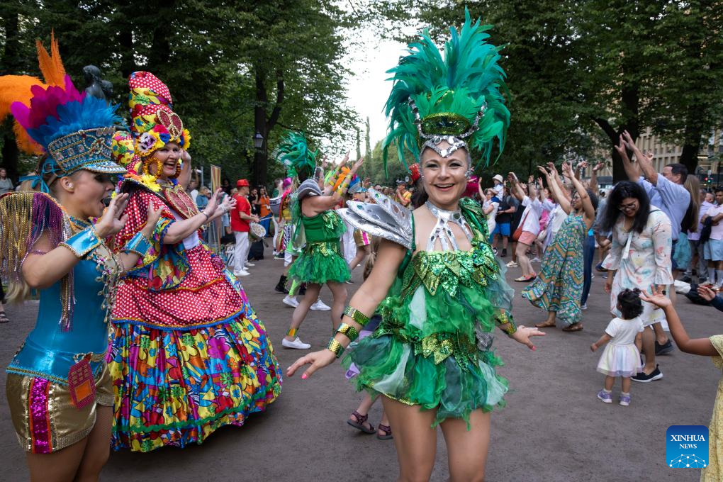 Performers dance during the Night of the Arts at a park in Helsinki, Finland on Aug. 15, 2024. The Night of the Arts took place on August 15th in Helsinki, celebrating its 35th anniversary this year. (Photo by Matti Matikainen/Xinhua)