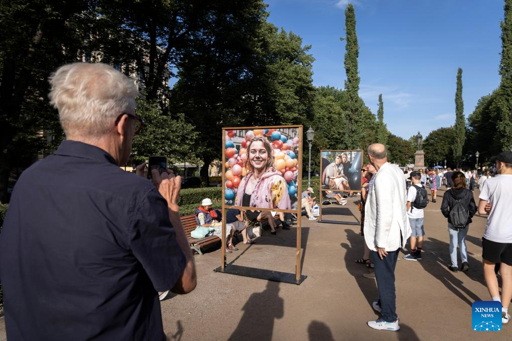 People appreciate art works created by artificial intelligence technologies during the Night of the Arts in Helsinki, Finland, Aug. 15, 2024. The Night of the Arts took place on August 15th in Helsinki, celebrating its 35th anniversary this year. (Photo by Matti Matikainen/Xinhua)