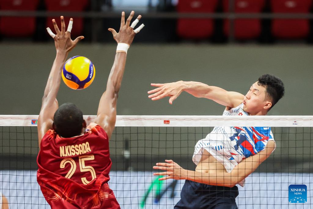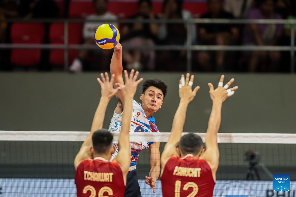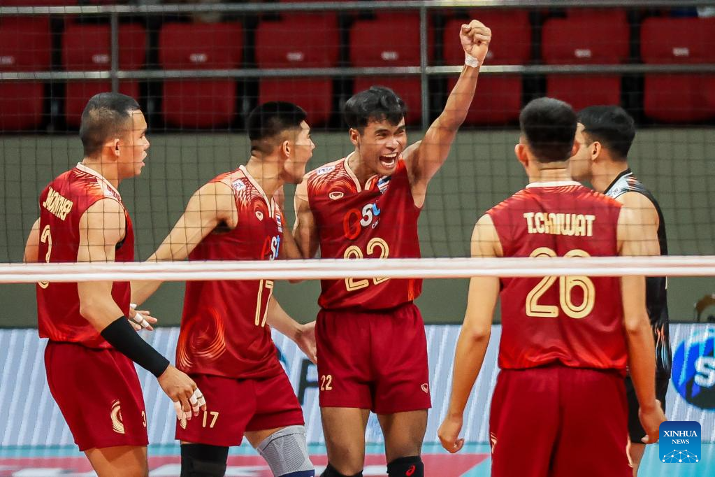 Players of Thailand celebrate scoring during the match between Thailand and Vietnam in the 1st leg of the Men's SEA Volleyball League in Manila, the Philippines, Aug. 17, 2024. (Xinhua/Rouelle Umali)