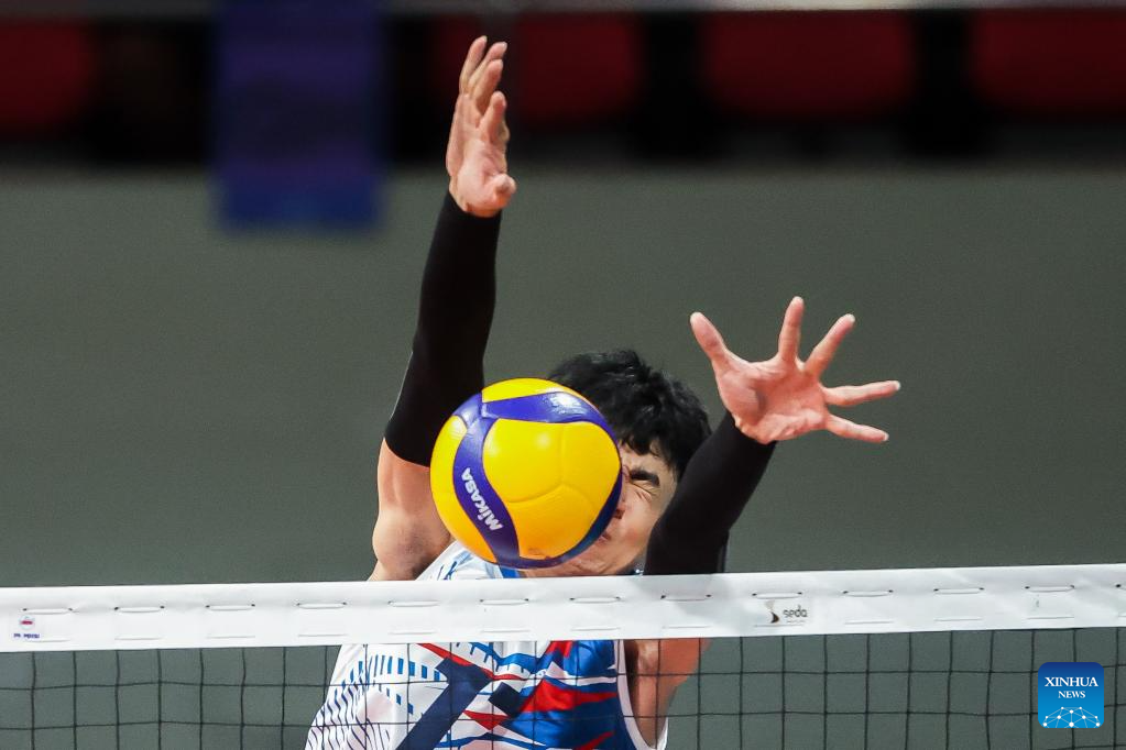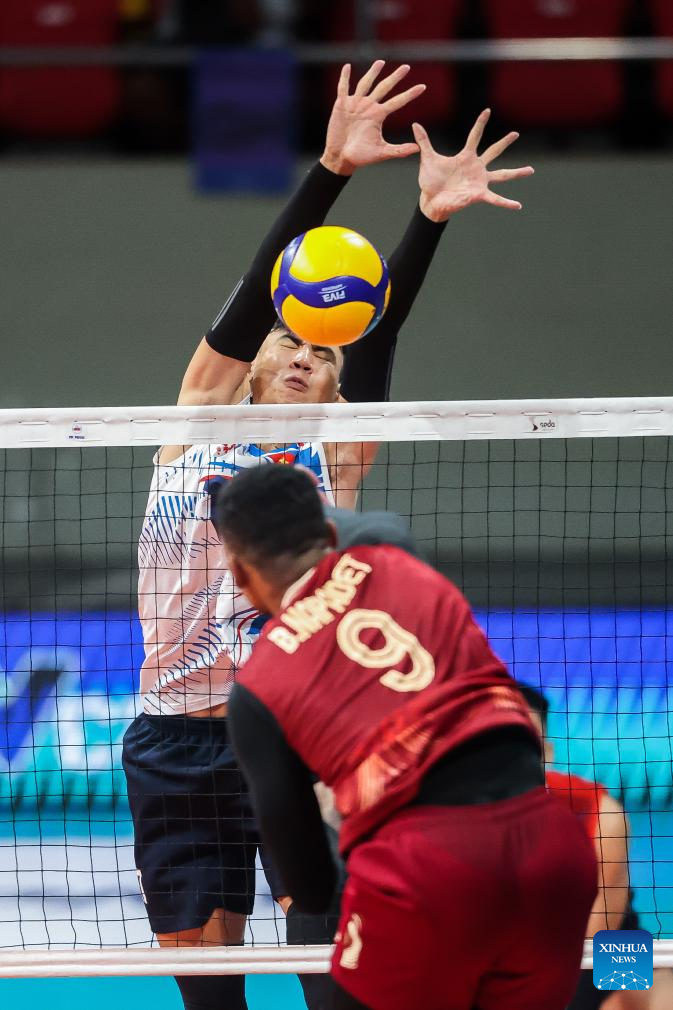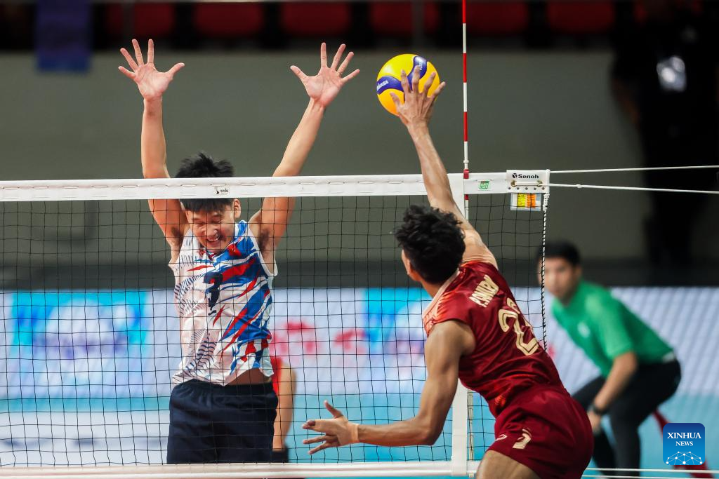 Ngoc Thuan Nguyen of Vietnam is hit in the face by the ball during the match between Thailand and Vietnam in the 1st leg of the Men's SEA Volleyball League in Manila, the Philippines, Aug. 17, 2024. (Xinhua/Rouelle Umali)
