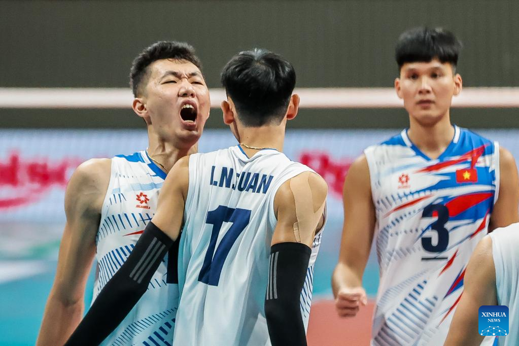 Players of Vietnam celebrate scoring during the match between Thailand and Vietnam in the 1st leg of the Men's SEA Volleyball League in Manila, the Philippines, Aug. 17, 2024. (Xinhua/Rouelle Umali)