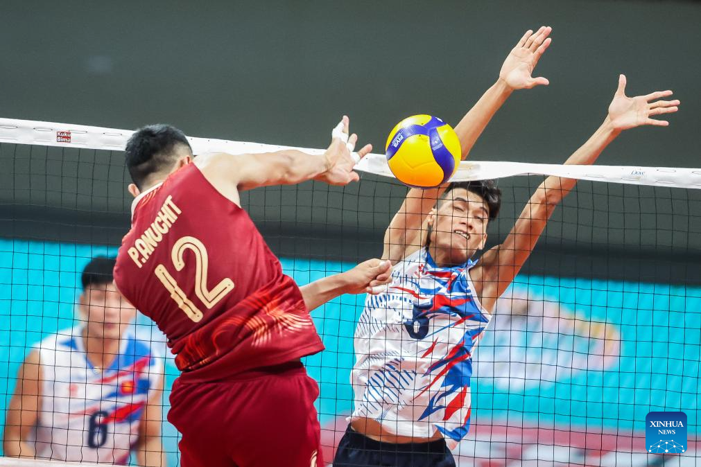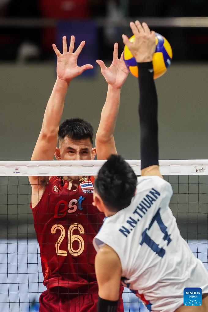 Anurak Phanram (R) of Thailand spikes the ball against Van Tien Duong of Vietnam during the match between Thailand and Vietnam in the 1st leg of the Men's SEA Volleyball League in Manila, the Philippines, Aug. 17, 2024. (Xinhua/Rouelle Umali)