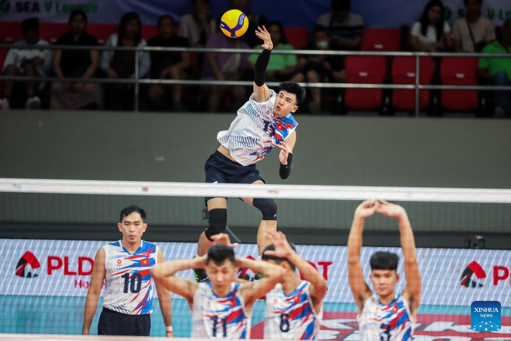 Van Hiep Pham (C) of Vietnam spikes the ball during the match between Thailand and Vietnam in the 1st leg of the Men's SEA Volleyball League in Manila, the Philippines, Aug. 17, 2024. (Xinhua/Rouelle Umali)