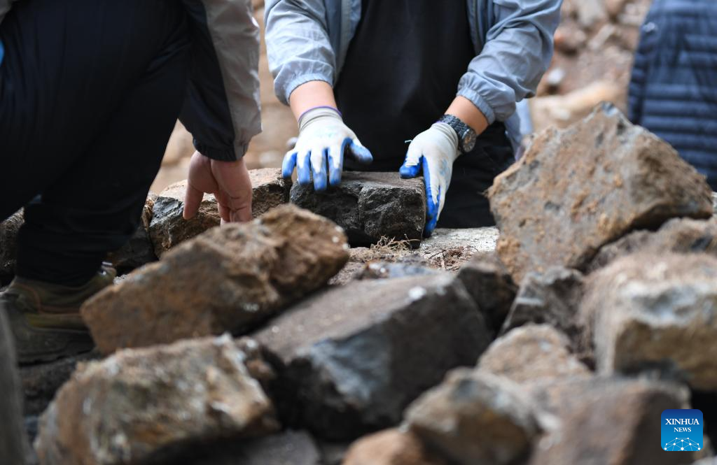 Bricks are seen at an archaeological site of a defense tower of the Jiankou section of the Great Wall in Beijing, capital of China, July 2, 2024. Covering six defense towers, from No. 117 to No. 122, the fifth phase of the Jiankou section of the Great Wall repair project has progressed smoothly. Beijing has pioneered Great Wall archaeological research, which precedes the repair work. The Jiankou section and the Dazhuangke section in Yanqing District have been selected as pilot projects to promote research-oriented restoration and protection of the Great Wall. (Xinhua/Chen Zhonghao)