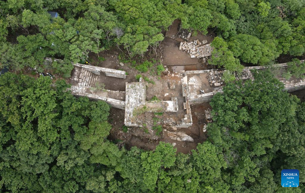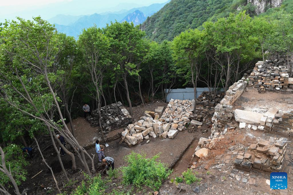 This photo shows an archaeological site of a defense tower of the Jiankou section of the Great Wall in Beijing, capital of China, July 2, 2024. Covering six defense towers, from No. 117 to No. 122, the fifth phase of the Jiankou section of the Great Wall repair project has progressed smoothly. Beijing has pioneered Great Wall archaeological research, which precedes the repair work. The Jiankou section and the Dazhuangke section in Yanqing District have been selected as pilot projects to promote research-oriented restoration and protection of the Great Wall. (Xinhua/Chen Zhonghao)