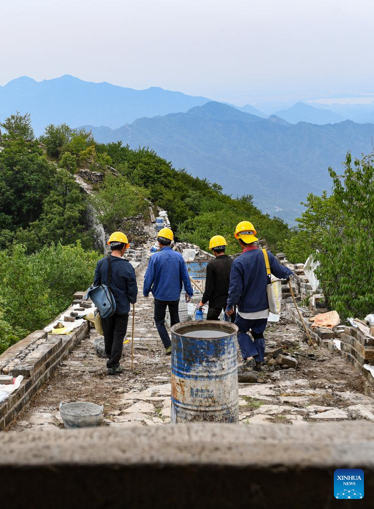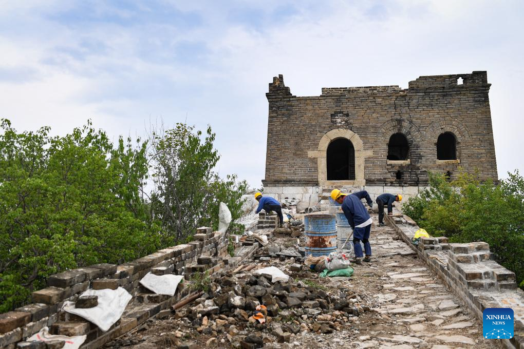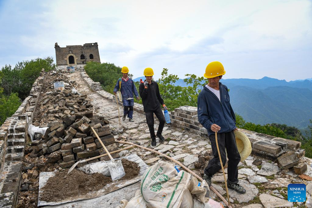 Workers repair walls near a defense tower of the Jiankou section of the Great Wall in Beijing, capital of China, July 2, 2024. Covering six defense towers, from No. 117 to No. 122, the fifth phase of the Jiankou section of the Great Wall repair project has progressed smoothly. Beijing has pioneered Great Wall archaeological research, which precedes the repair work. The Jiankou section and the Dazhuangke section in Yanqing District have been selected as pilot projects to promote research-oriented restoration and protection of the Great Wall. (Xinhua/Chen Zhonghao)