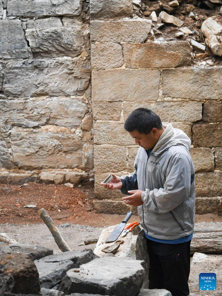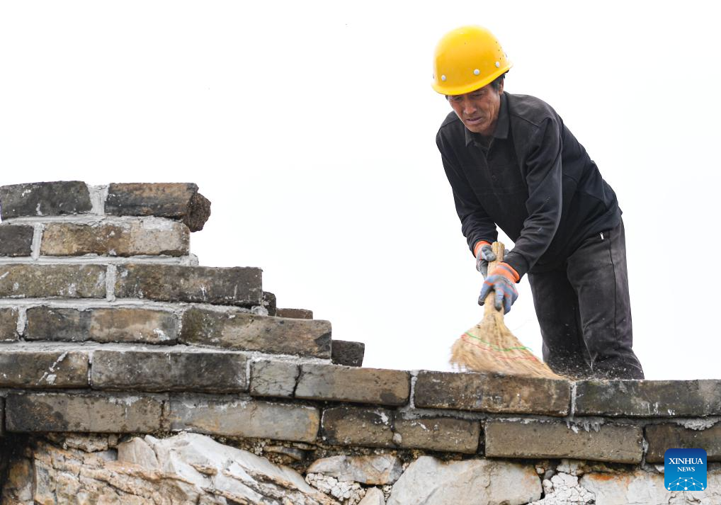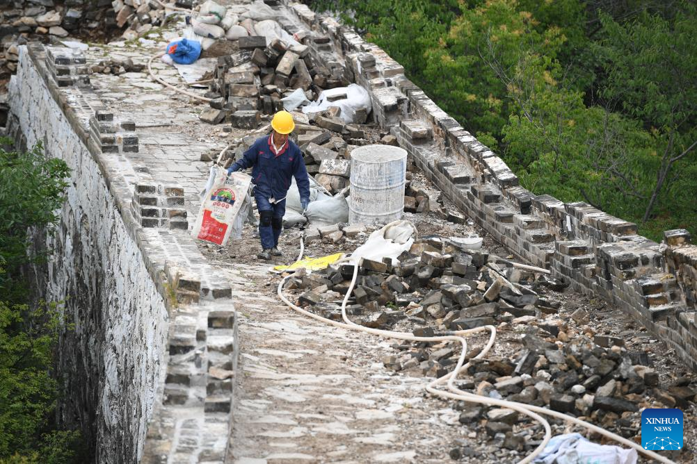 A worker repairs a wall near a defense tower of the Jiankou section of the Great Wall in Beijing, capital of China, July 2, 2024. Covering six defense towers, from No. 117 to No. 122, the fifth phase of the Jiankou section of the Great Wall repair project has progressed smoothly. Beijing has pioneered Great Wall archaeological research, which precedes the repair work. The Jiankou section and the Dazhuangke section in Yanqing District have been selected as pilot projects to promote research-oriented restoration and protection of the Great Wall. (Xinhua/Chen Zhonghao)