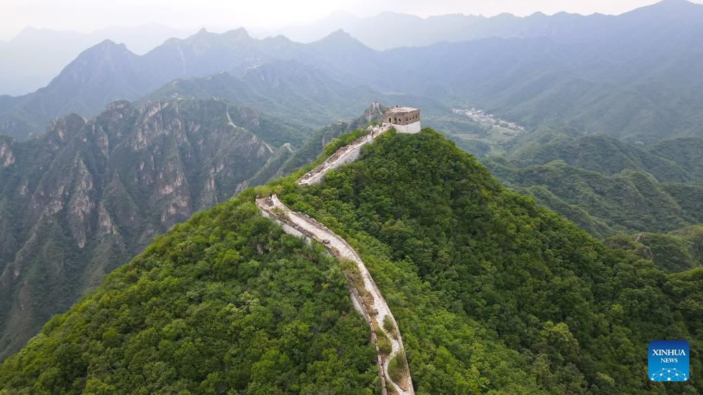 An aerial drone photo shows a defense tower of the Jiankou section of the Great Wall in Beijing, capital of China, July 1, 2024. Covering six defense towers, from No. 117 to No. 122, the fifth phase of the Jiankou section of the Great Wall repair project has progressed smoothly. Beijing has pioneered Great Wall archaeological research, which precedes the repair work. The Jiankou section and the Dazhuangke section in Yanqing District have been selected as pilot projects to promote research-oriented restoration and protection of the Great Wall. (Xinhua/Chen Zhonghao)