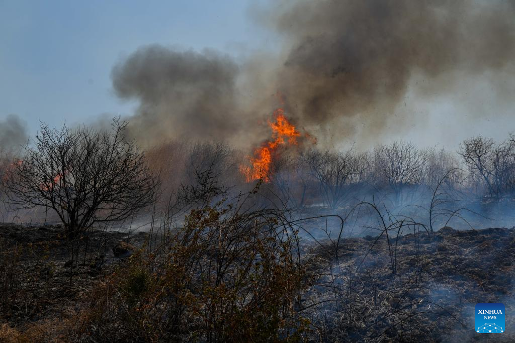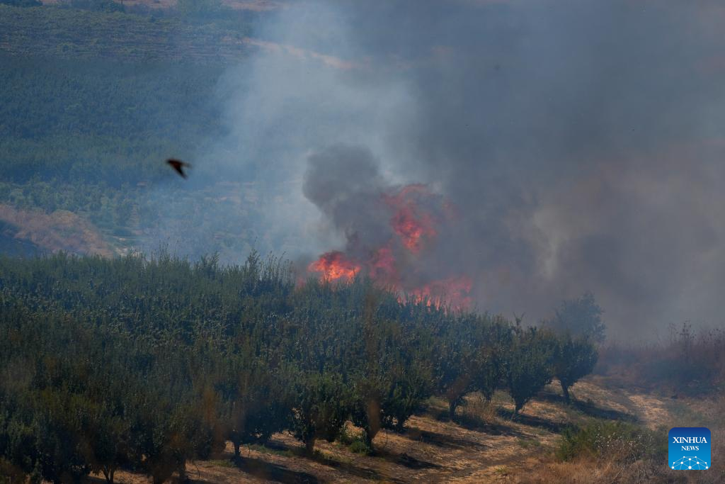 Wildfires are seen following rocket attacks from Lebanon, near Ayelet HaShahar, in northern Israel on Aug. 17, 2024. Hezbollah attacked on Saturday morning the settlement of Ayelet HaShahar in northern Israel for the first time with Katyusha rockets, in response to the Israeli attack on the Wadi al-Kfour area in Nabatieh which killed 10 civilians and injuring five others, Lebanese militant group said in a statement. (Ayal Margolin/JINI via Xinhua)
