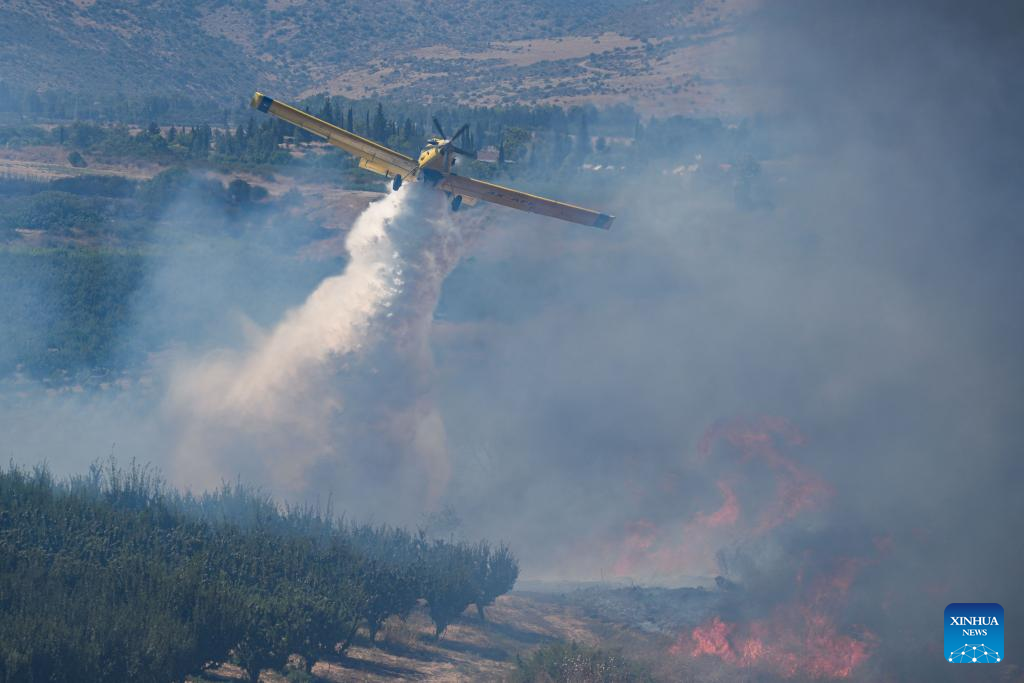 A firefighting plane flies to extinguish wildfires following rocket attacks from Lebanon, near Ayelet HaShahar, in northern Israel on Aug. 17, 2024. Hezbollah attacked on Saturday morning the settlement of Ayelet HaShahar in northern Israel for the first time with Katyusha rockets, in response to the Israeli attack on the Wadi al-Kfour area in Nabatieh which killed 10 civilians and injuring five others, Lebanese militant group said in a statement. (Ayal Margolin/JINI via Xinhua)