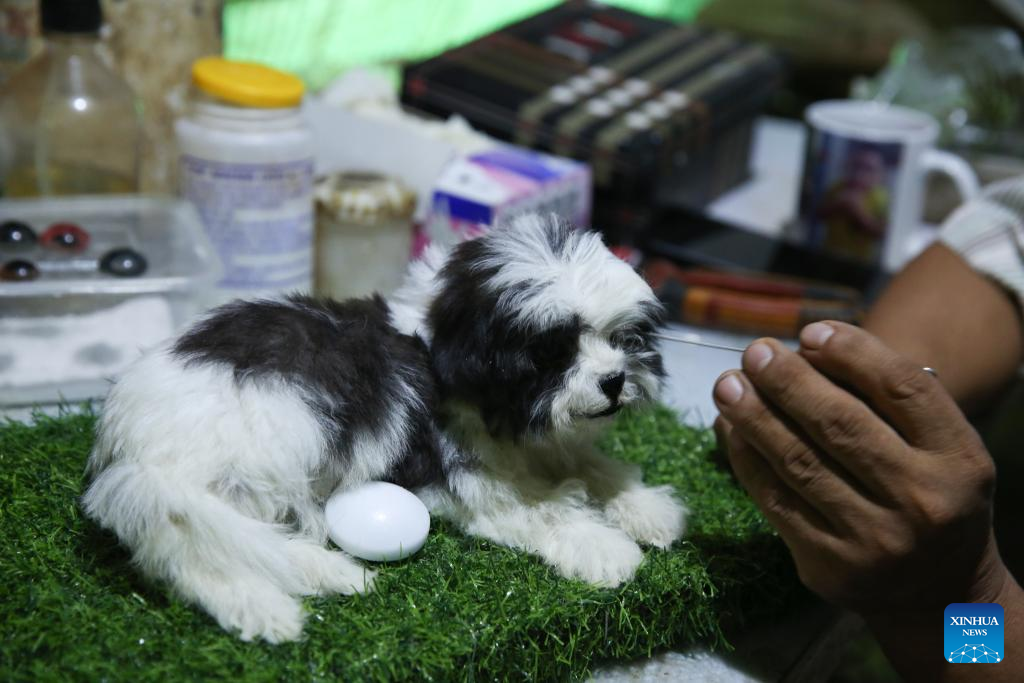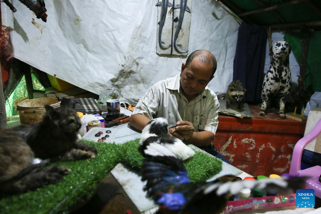 A taxidermist works at a workshop in Yangon, Myanmar, Aug. 18, 2024. (Photo by Myo Kyaw Soe/Xinhua)