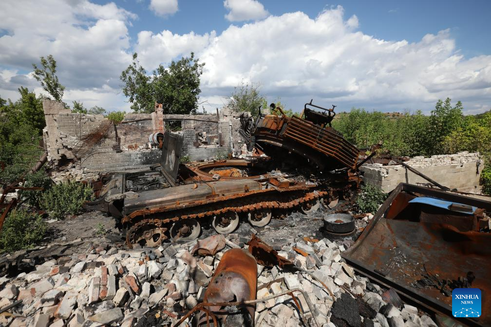 This photo taken on Aug. 15, 2024 shows a Ukrainian tank destroyed during Russian attacks in Toretsk. (Photo by Peter Druk/Xinhua)