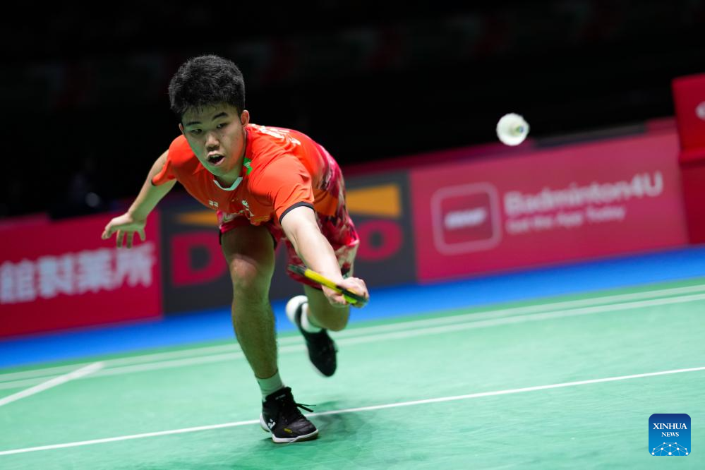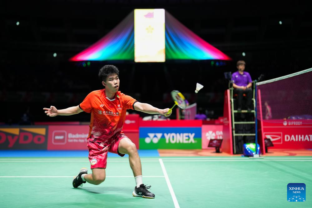Shi Yuqi of China hits a return during the men's singles round of 32 match against Su Li Yang of Chinese Taipei at the Japan Badminton Open 2024 in Yokohama, Japan, on Aug. 20, 2024. (Xinhua/Zhang Xiaoyu)