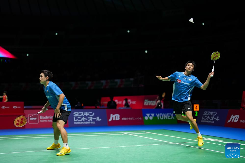 Hoki Takuro/Kobayashi Yugo (R) of Japan compete during the men's doubles round of 32 match against Chiu Hsiang Chieh/Wang Chi-Lin of Chinese Taipei at the Japan Badminton Open 2024 in Yokohama, Japan, on Aug. 20, 2024. (Xinhua/Zhang Xiaoyu)