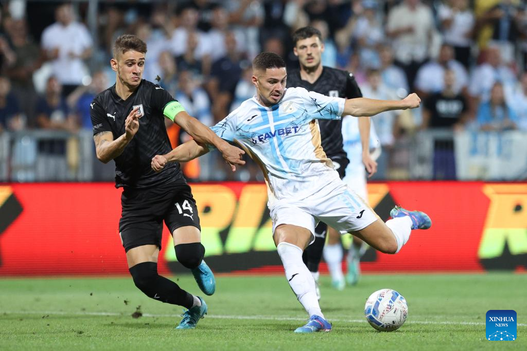 Franjo Ivanovic (R) of HNK Rijeka competes against Marcel Ratnik of Olimpija Ljubljana during their first leg match of UEFA Conference League play-offs in Rijeka, Croatia, on Aug. 22, 2024. (Photo by Nel Pavletic/PIXSELL via Xinhua)