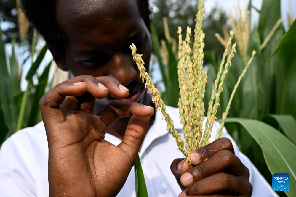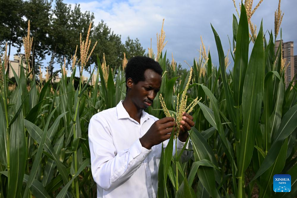Gatera observes the maize at a field affiliated to Anhui Agricultural University in Hefei, east China's Anhui Province, Aug. 13, 2024. (Xinhua/Huang Bohan)
