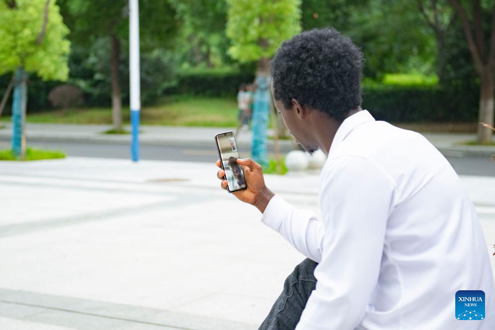 Gatera makes a video call with his family member on the campus of Anhui Agricultural University in Hefei, east China's Anhui Province, Aug. 13, 2024. (Xinhua/Fu Tian)