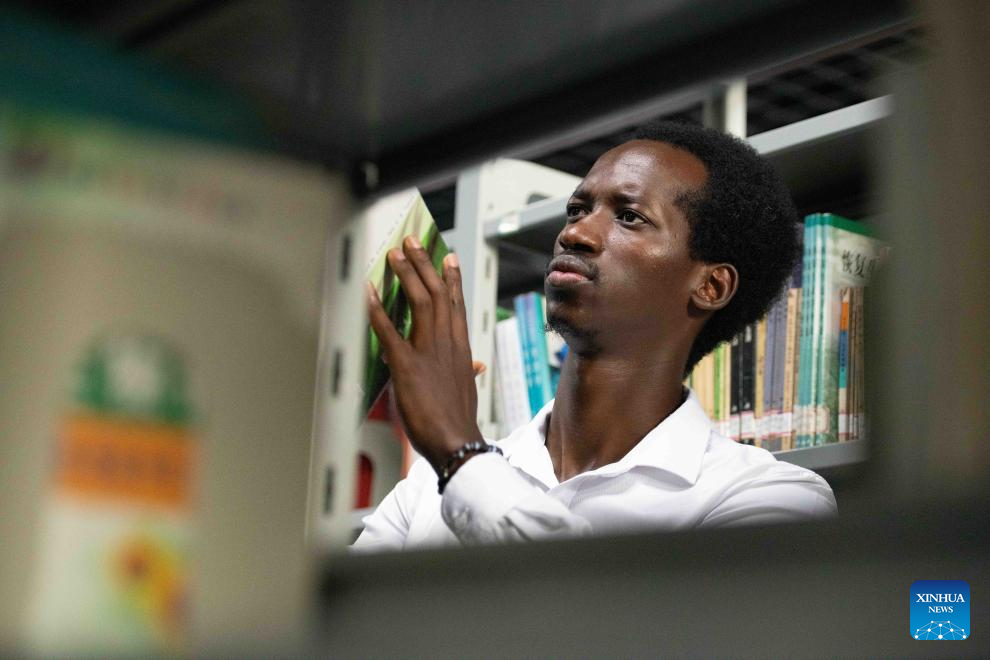 Gatera looks for books at a library of Anhui Agricultural University in Hefei, east China's Anhui Province, Aug. 21, 2024. (Xinhua/Zhang Duan)
