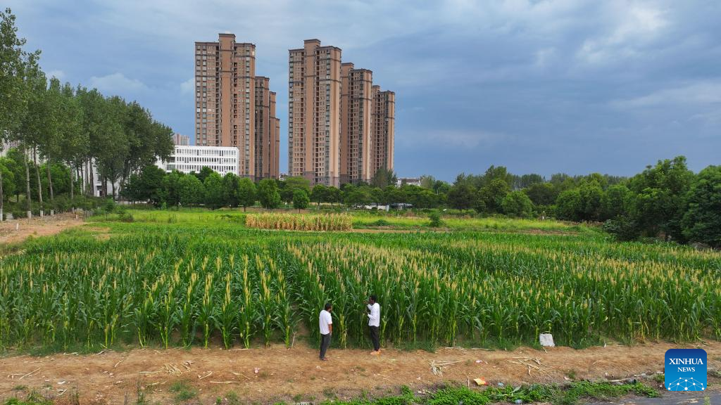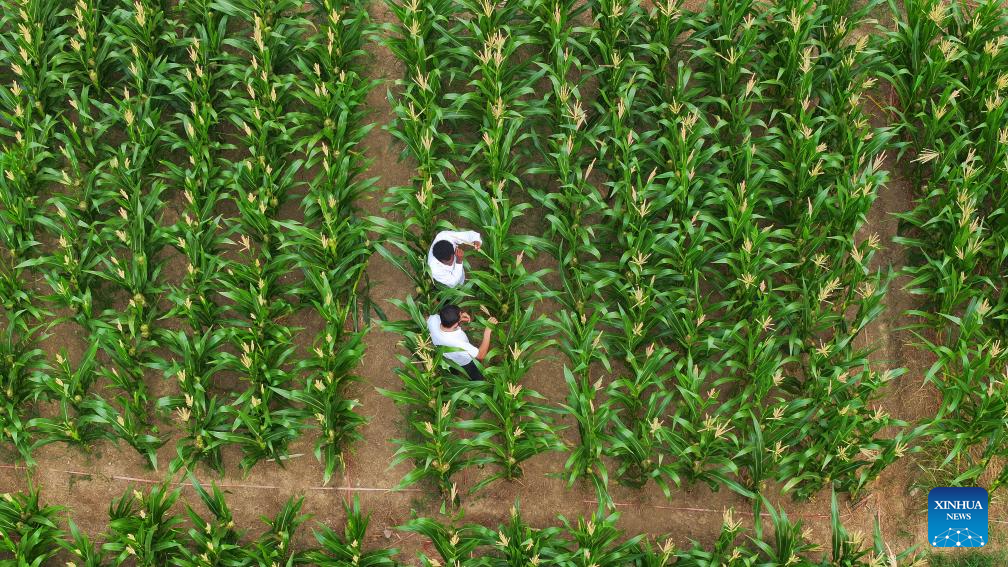 Gatera checks the maize at a field affiliated to Anhui Agricultural University in Hefei, east China's Anhui Province, Aug. 13, 2024. (Xinhua/Huang Bohan)