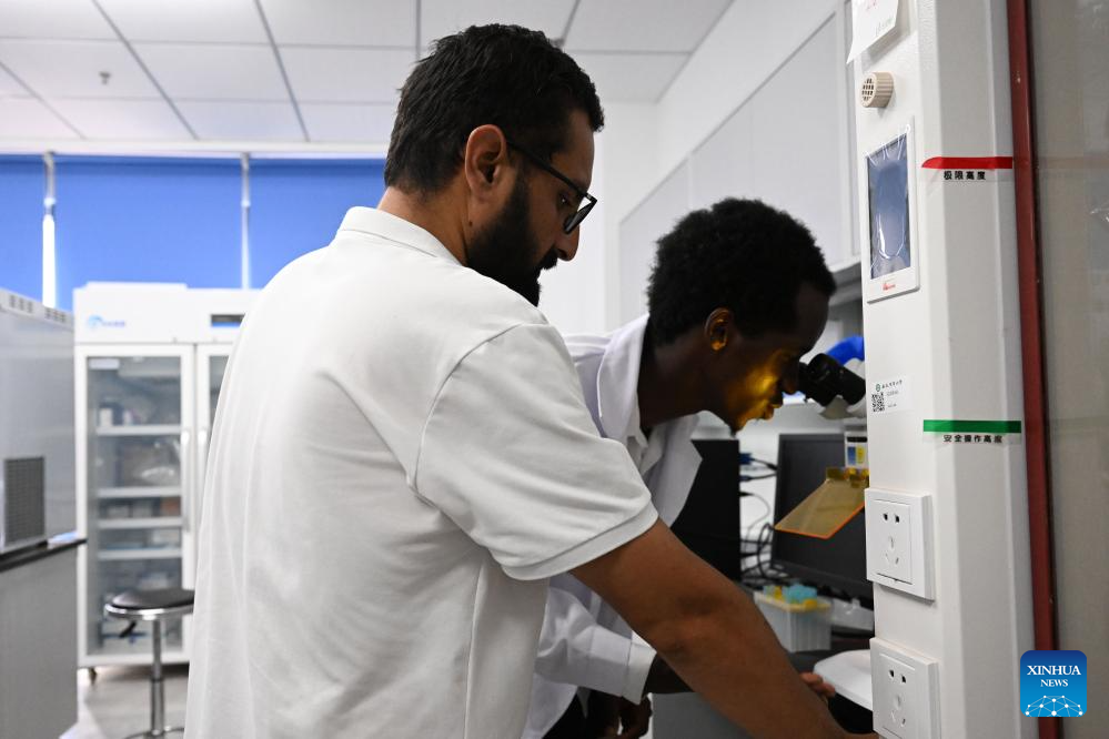 Gatera (R) and his classmate observe pollen samples at laboratory of Anhui Agricultural University in Hefei, east China's Anhui Province, Aug. 13, 2024. (Xinhua/Huang Bohan)