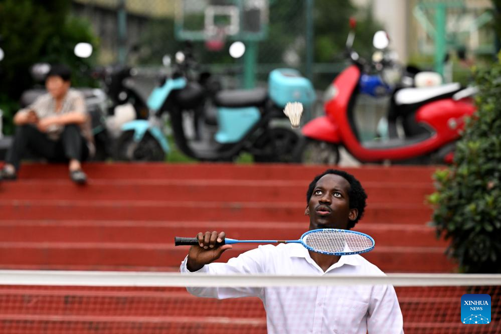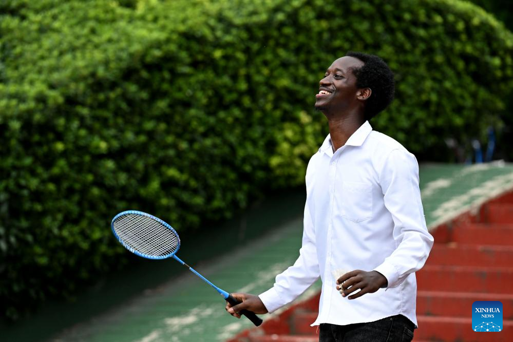 Gatera plays badminton on the campus of Anhui Agricultural University in Hefei, east China's Anhui Province, Aug. 13, 2024. (Xinhua/Huang Bohan)