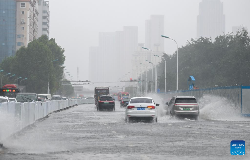 Vehicles wade through water on a road in Nankai District of north China's Tianjin, Aug. 26, 2024. Tianjin Municipality upgraded its rainstorm alert on Monday morning after experiencing the heaviest rainfall of this year's flood season. From 7 a.m. on Sunday to 2 p.m. Monday, the city's average rainfall reached 85.6 mm, with a peak of 280.9 mm. (Xinhua/Sun Fanyue)