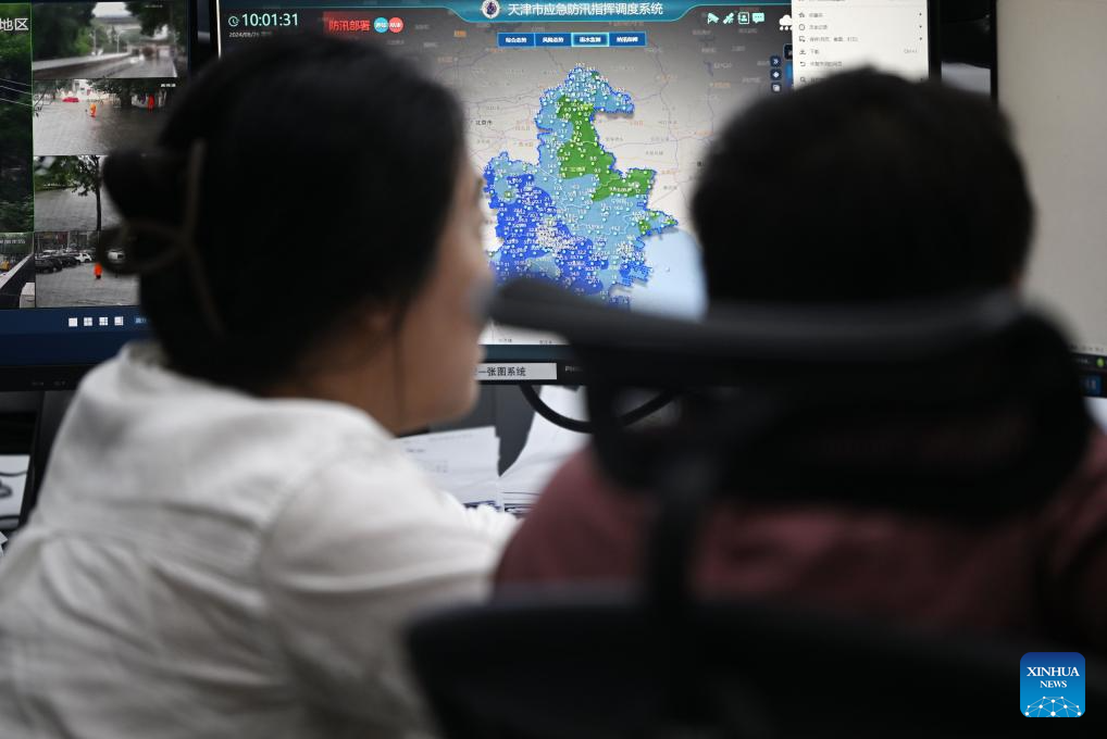 Staff members are on duty at the command center of the emergency management bureau of north China's Tianjin, Aug. 26, 2024. Tianjin Municipality upgraded its rainstorm alert on Monday morning after experiencing the heaviest rainfall of this year's flood season. From 7 a.m. on Sunday to 2 p.m. Monday, the city's average rainfall reached 85.6 mm, with a peak of 280.9 mm. (Xinhua/Li Ran)