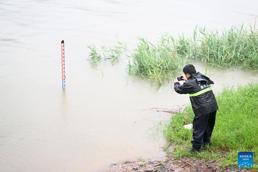 A staff member checks the water situation of Qingjinghuang drainage canal in Xiaowangzhuang Town in the Binhai New Area of north China's Tianjin, Aug. 26, 2024. Tianjin Municipality upgraded its rainstorm alert on Monday morning after experiencing the heaviest rainfall of this year's flood season. From 7 a.m. on Sunday to 2 p.m. Monday, the city's average rainfall reached 85.6 mm, with a peak of 280.9 mm. (Xinhua/Li Ran)