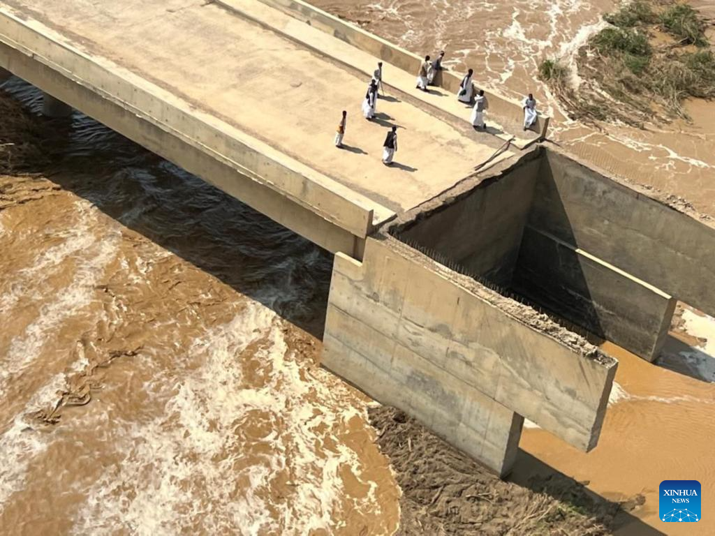 People are seen on a bridge damaged due to floods after the collapse of Arbaat Dam in Red Sea State, Sudan, on Aug. 26, 2024. Arbaat Dam in eastern Sudan collapsed on Sunday, causing severe flooding that has killed at least 60 people, with hundreds still missing, a Sudanese official reported on Monday. (Sudan's Transitional Sovereign Council/Handout via Xinhua)