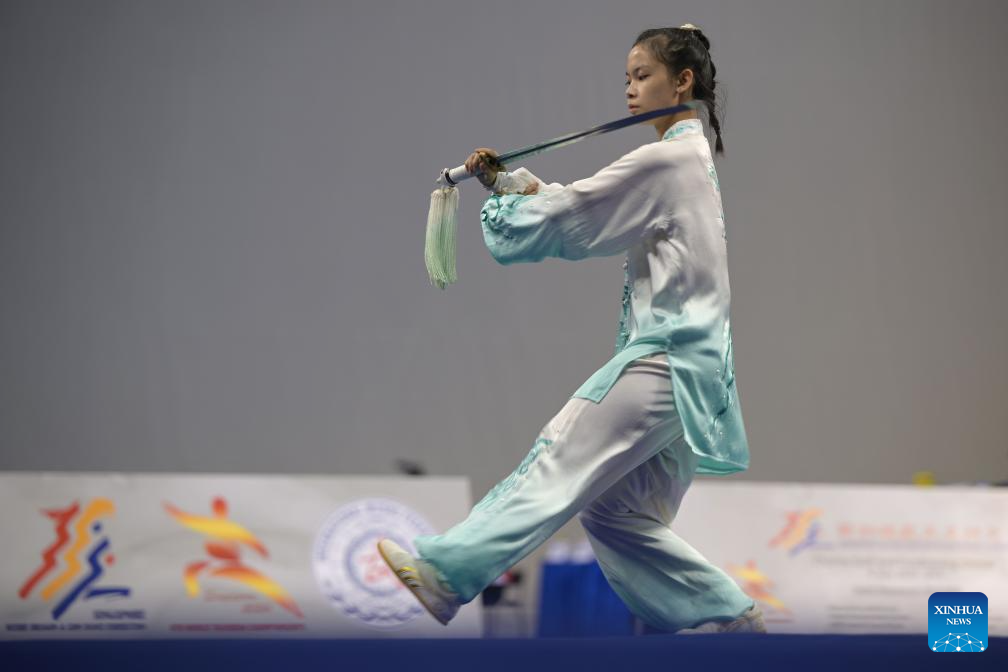 Tran Thi Kieu Trang of Vietnam competes during the women's A & B group Wu Style Taijiquan (46 movements) competition at the 4th World Taijiquan Championships in Singapore, Aug. 27, 2024. (Photo by Then Chih Wey/Xinhua)