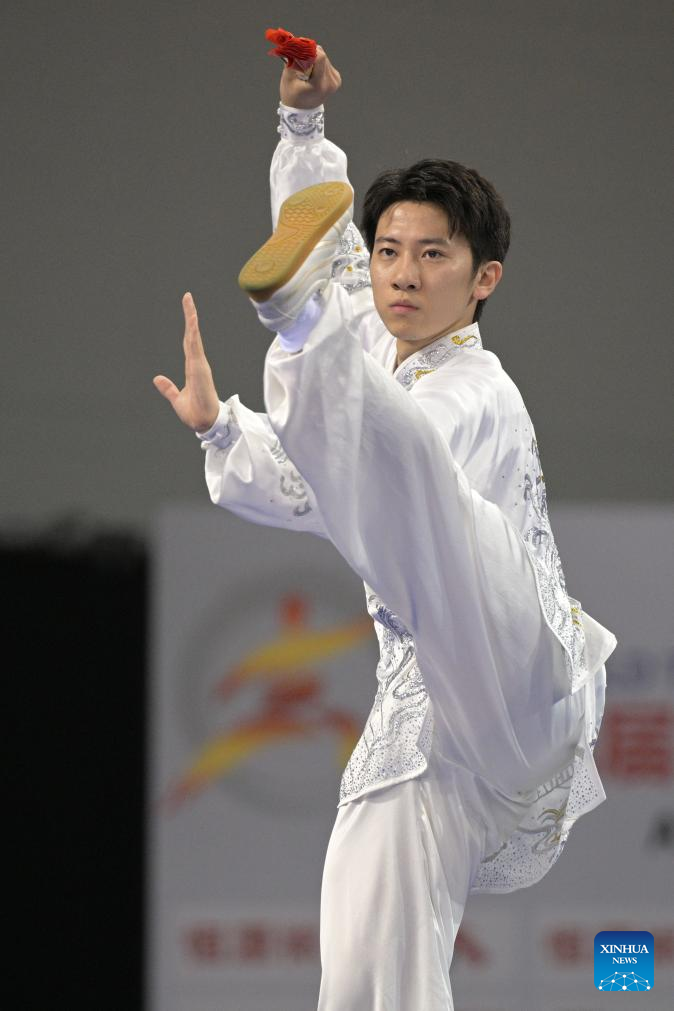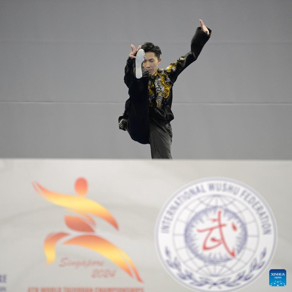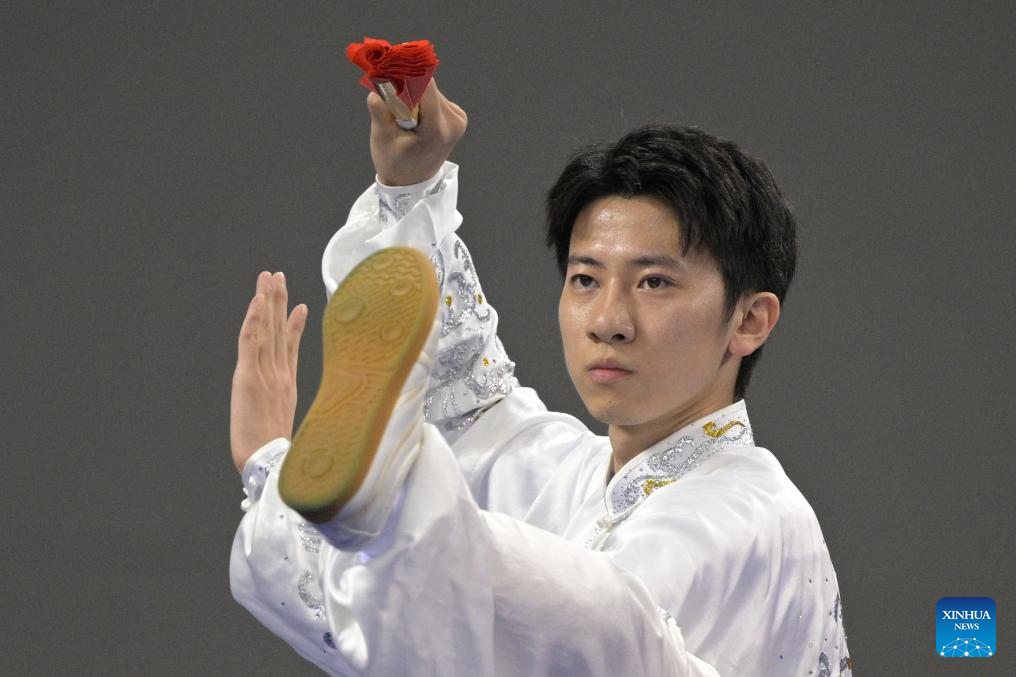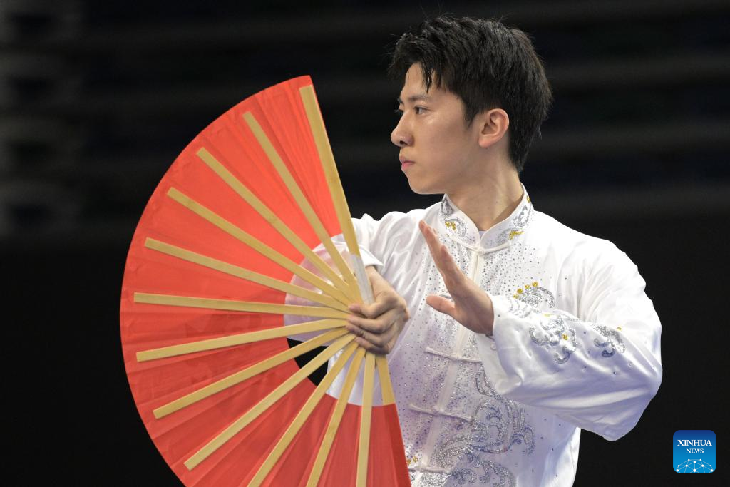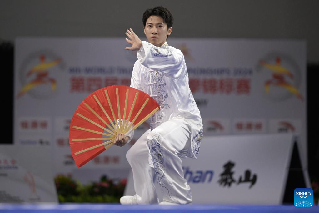 Ji Hao of China competes during the men's A & B group 3rd Set Taijishan competition at the 4th World Taijiquan Championships in Singapore, Aug. 27, 2024. (Photo by Then Chih Wey/Xinhua)