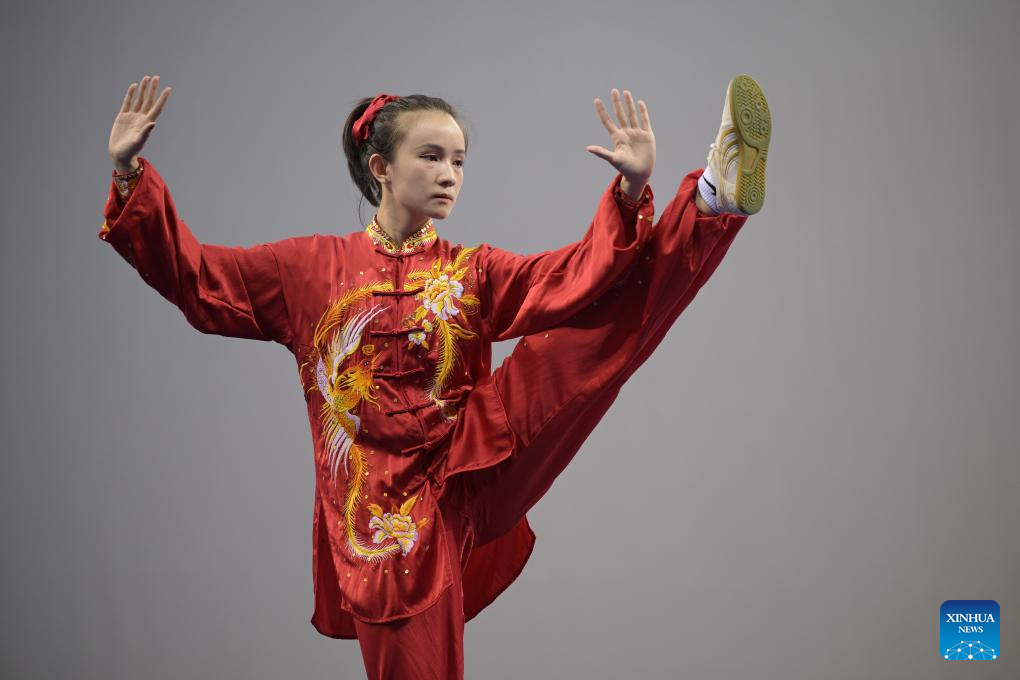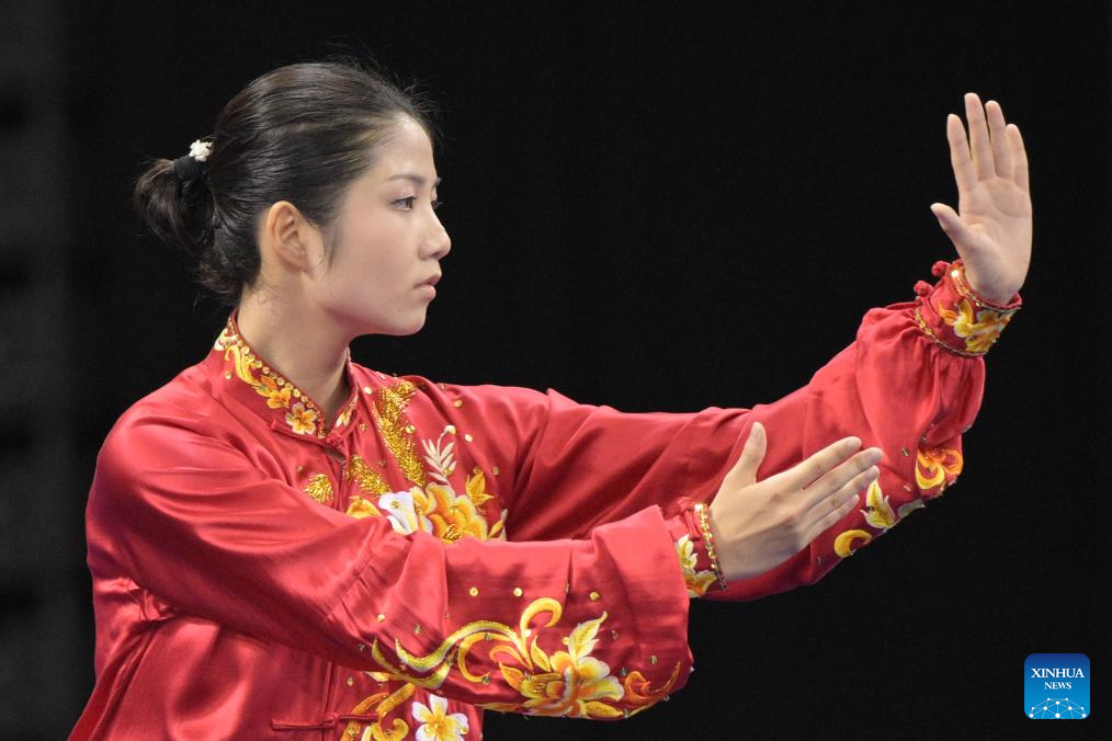 Deng Zhixuan of China competes during the women's A & B group Wu Style Taijiquan (46 movements) competition at the 4th World Taijiquan Championships in Singapore, Aug. 27, 2024. (Photo by Then Chih Wey/Xinhua)