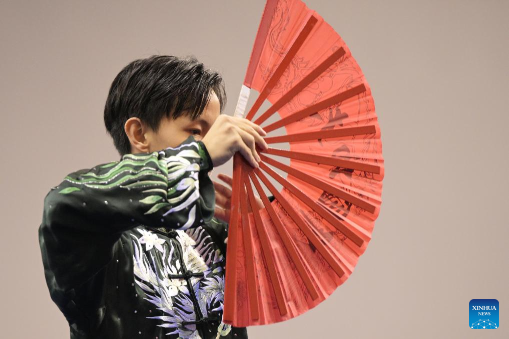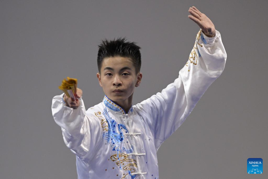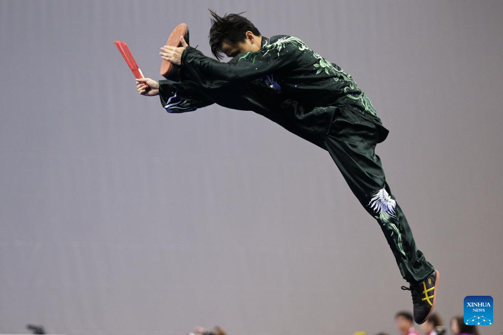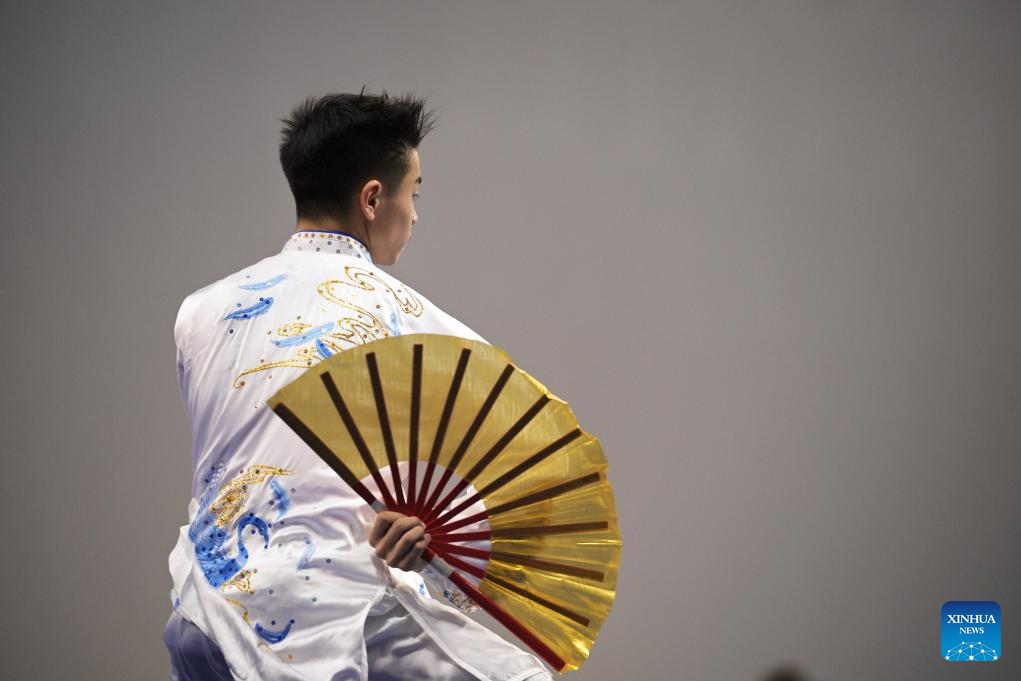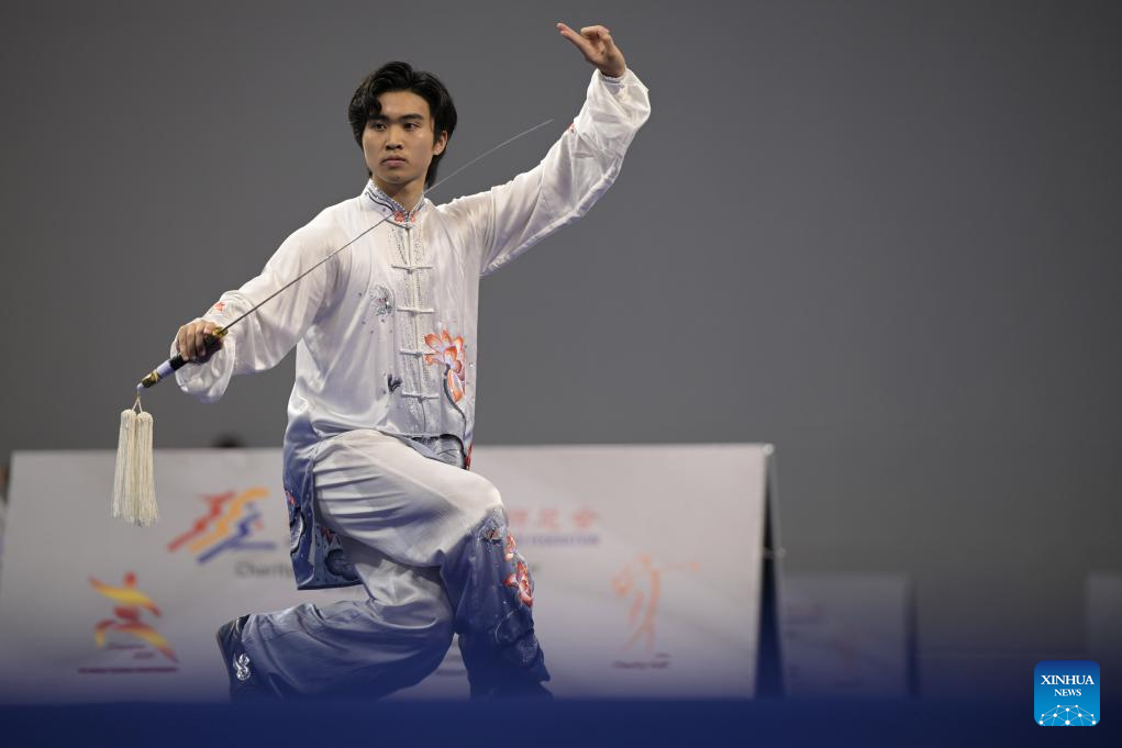 Chan Jun Kai of Singapore competes in the Men's New Chen Style Taijiquan category at the 4th World Taijiquan Championships in Singapore, Aug. 27, 2024. (Photo by Then Chih Wey/Xinhua)