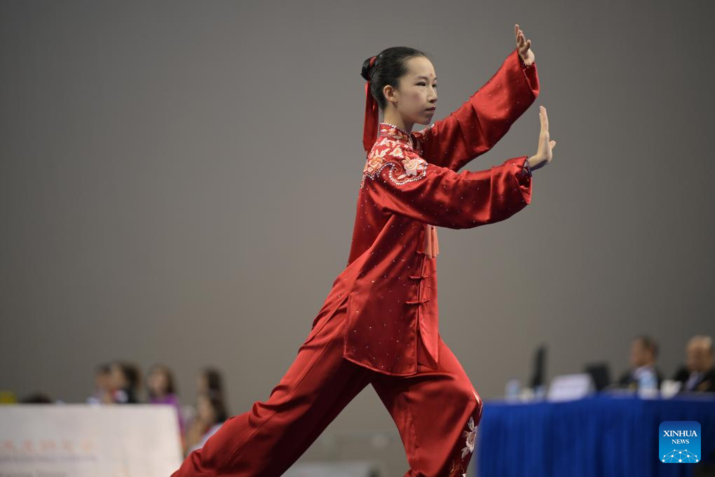 Charlotte Ng Leting of Singapore competes in the Women's 3rd Set Taijiquan (39 Movements) category at the 4th World Taijiquan Championships in Singapore, Aug. 27, 2024. (Photo by Then Chih Wey/Xinhua)
