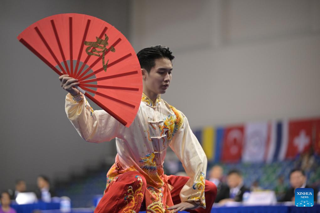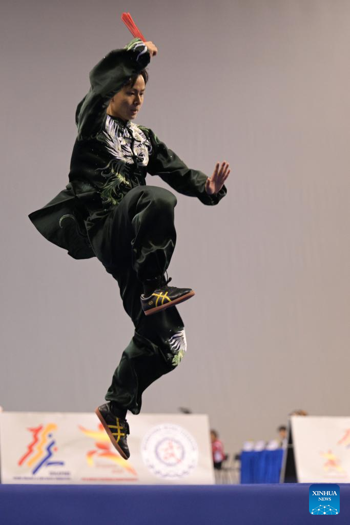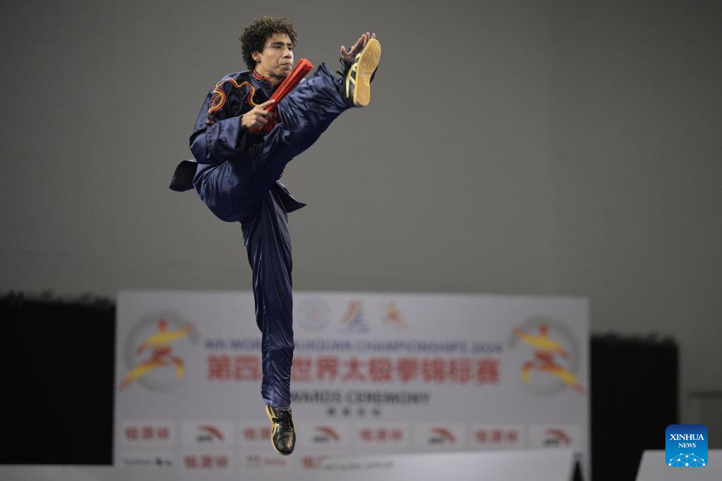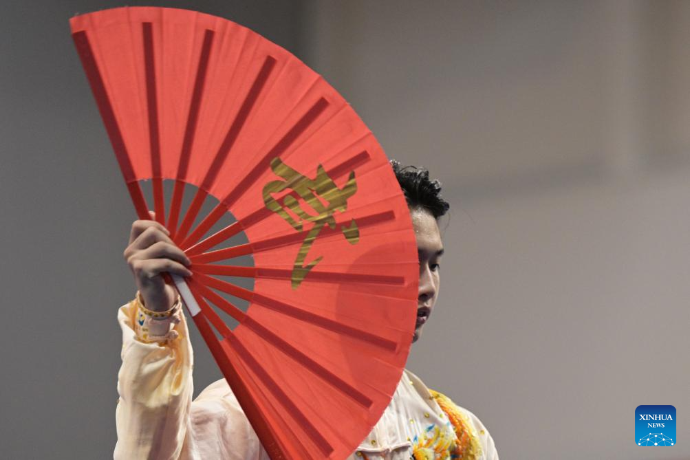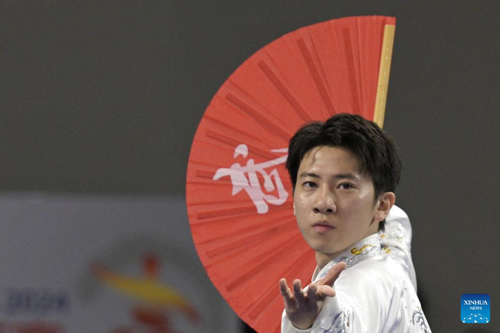 Hui Tak Yan Samuei of China's Hong Kong competes in the Men's New Chen Style Taijiquan category at the 4th World Taijiquan Championships in Singapore, Aug. 27, 2024. (Photo by Then Chih Wey/Xinhua)