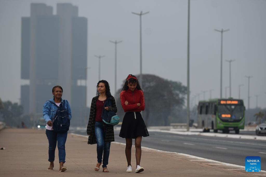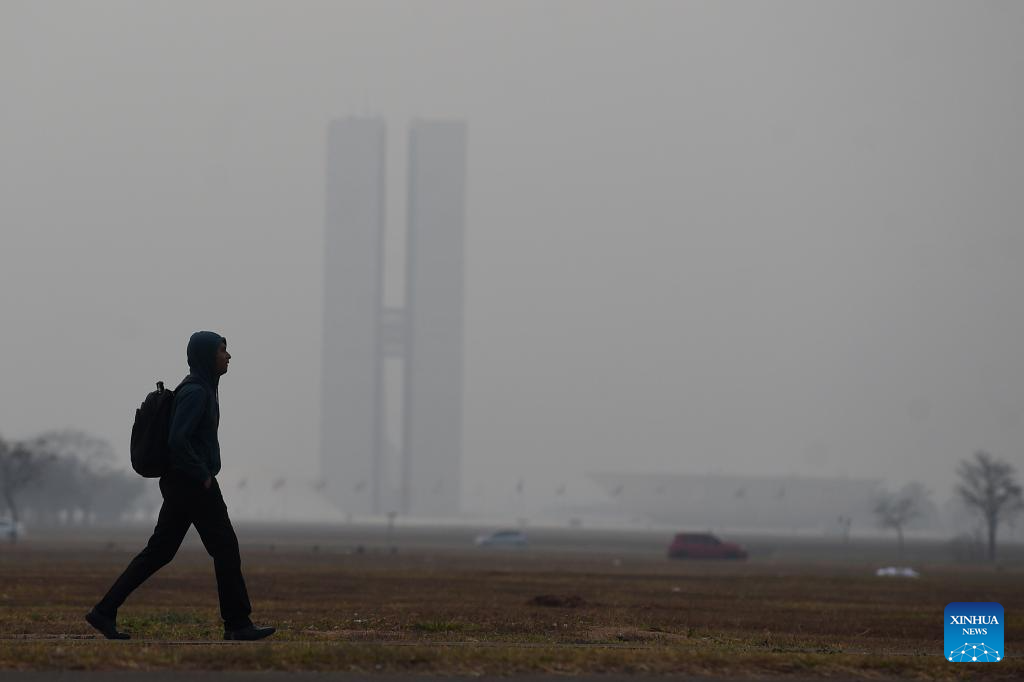 A man walks on the street as the National Congress building is covered by smoke in Brasilia, Brazil, Aug. 26, 2024. (Photo by Lucio Tavora/Xinhua)