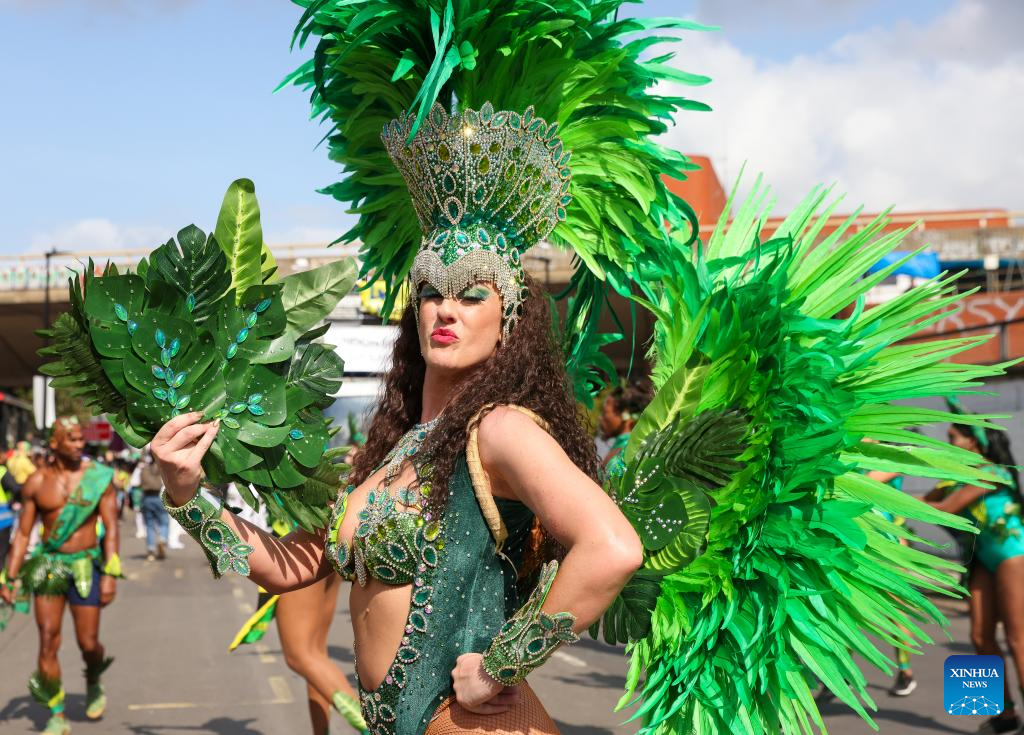 A performer participates in Notting Hill Carnival in London, Britain, on Aug. 26, 2024. Originated in the 1960s, the carnival is a way for Afro-Caribbean communities to celebrate their cultures and traditions. (Xinhua)