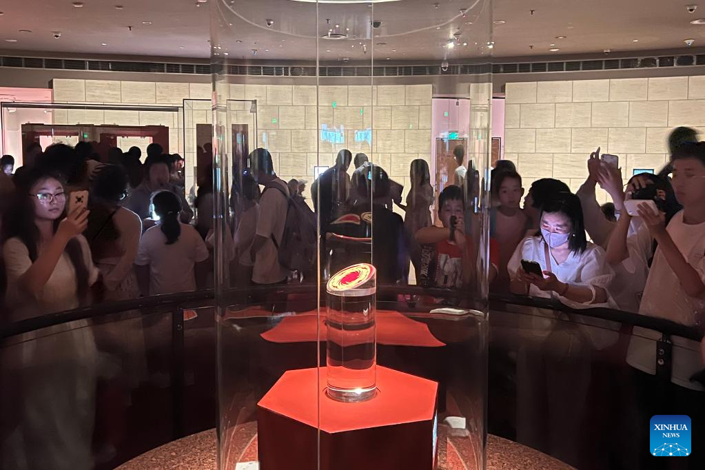 Visitors take photos of the Sun and Immortal Birds gold ornament at the Jinsha Site Museum in Chengdu, southwest China's Sichuan Province, July 13, 2024. (Xinhua/Kang Jinqian)