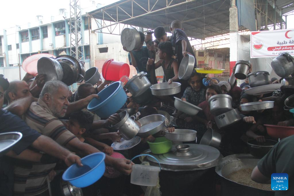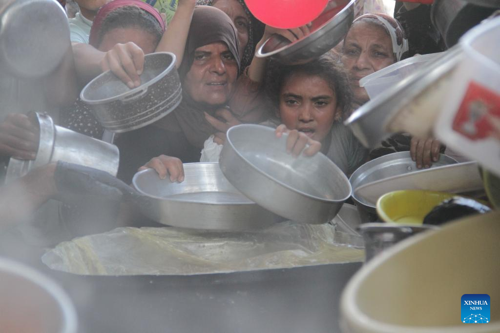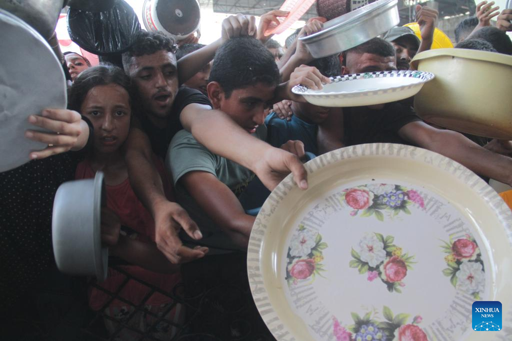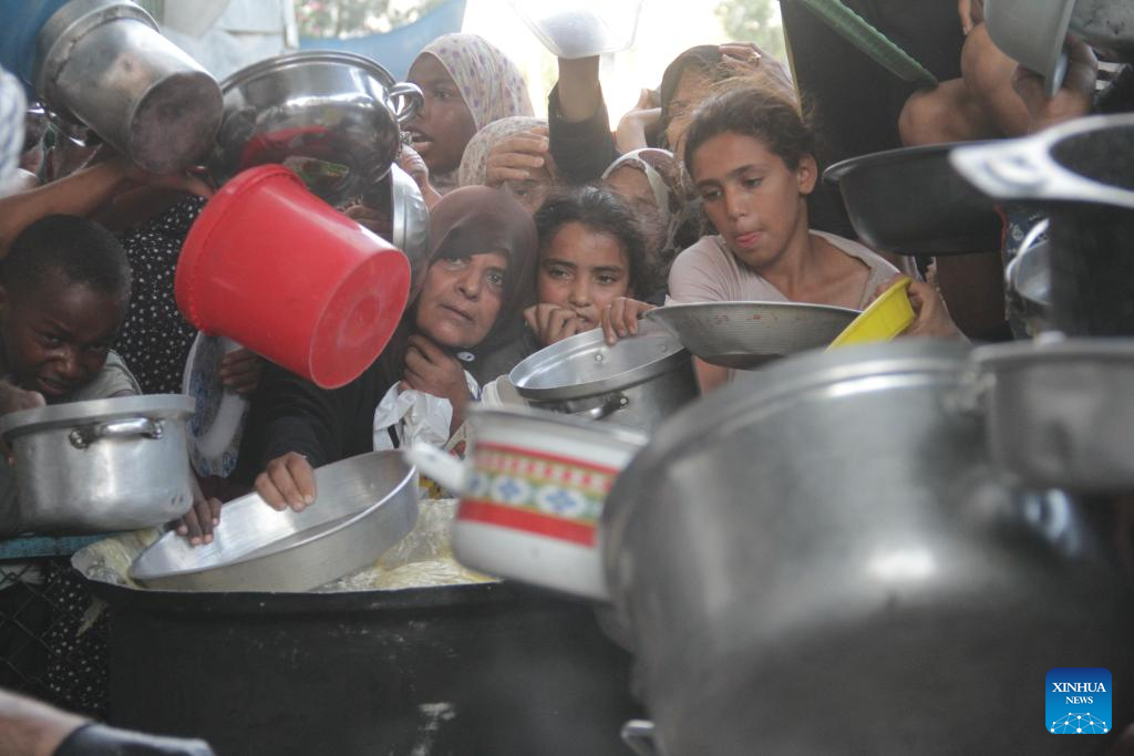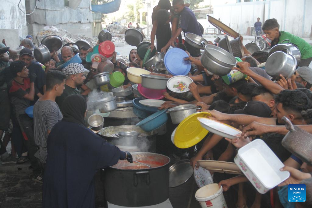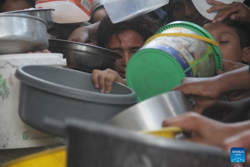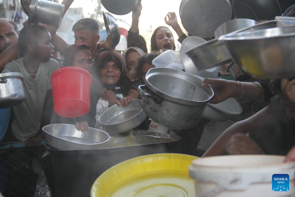 People try to get food relief in Jabalia refugee camp, northern Gaza Strip, on Aug. 29, 2024. Gaza is now in the grip of a severe humanitarian crisis, with millions displaced and necessities such as food, medicine and clean water in critical shortage. In July, UN experts warned that famine has spread throughout the Gaza Strip. (Photo by Mahmoud Zaki/Xinhua)