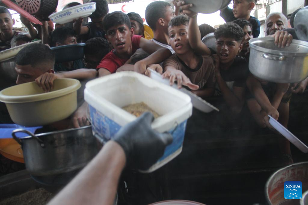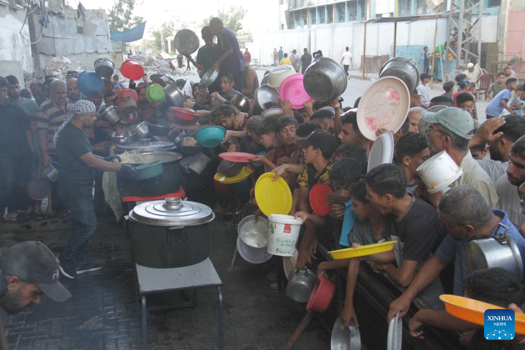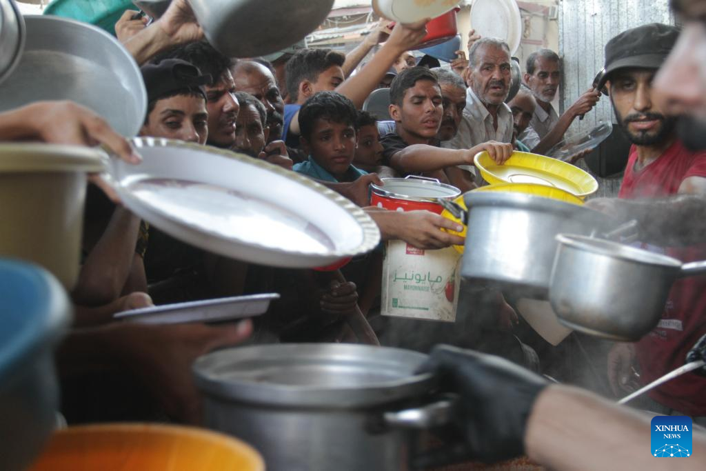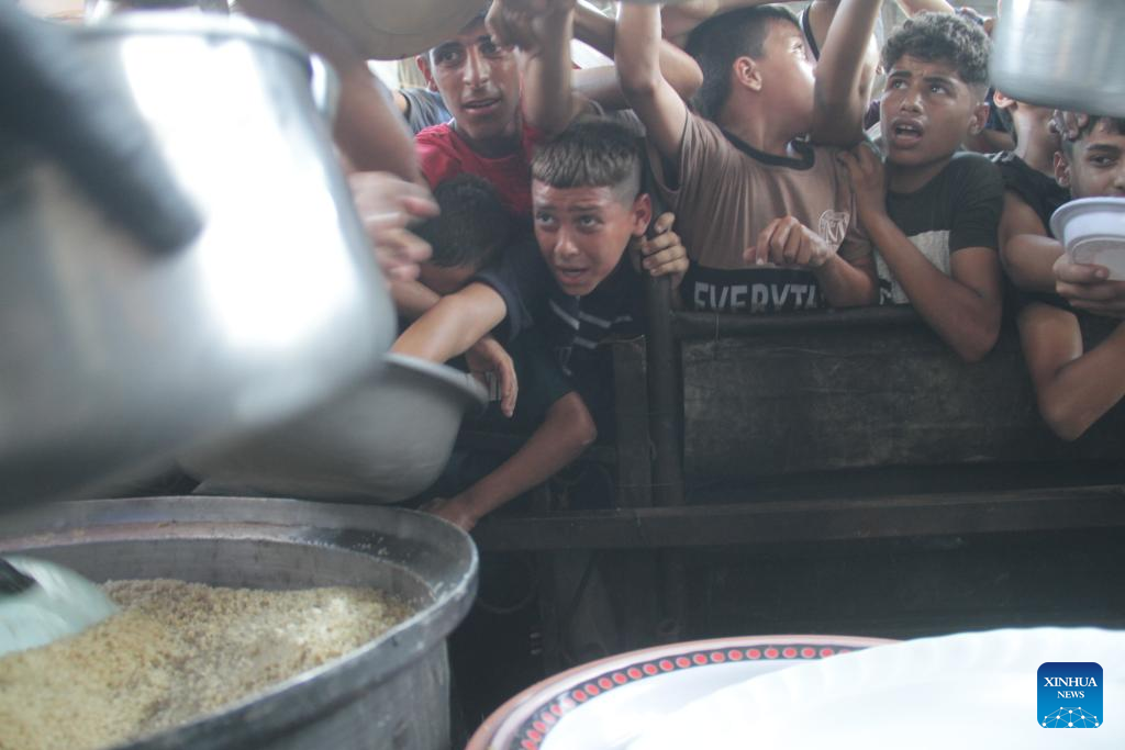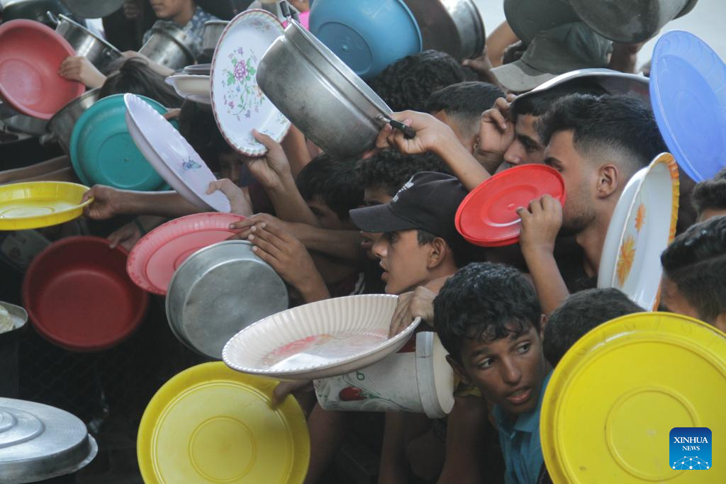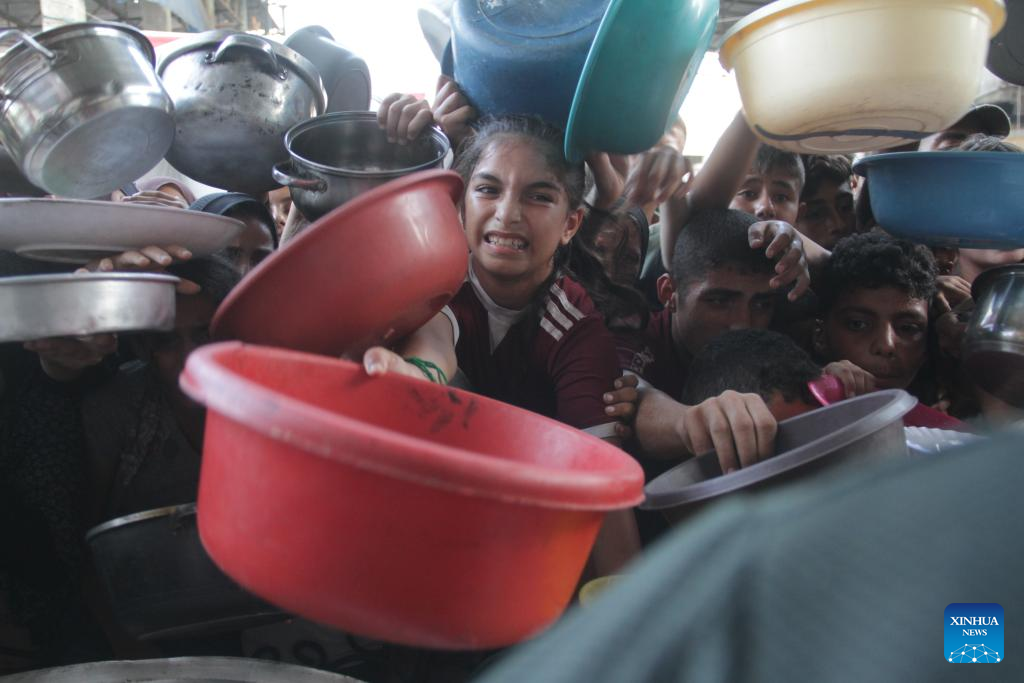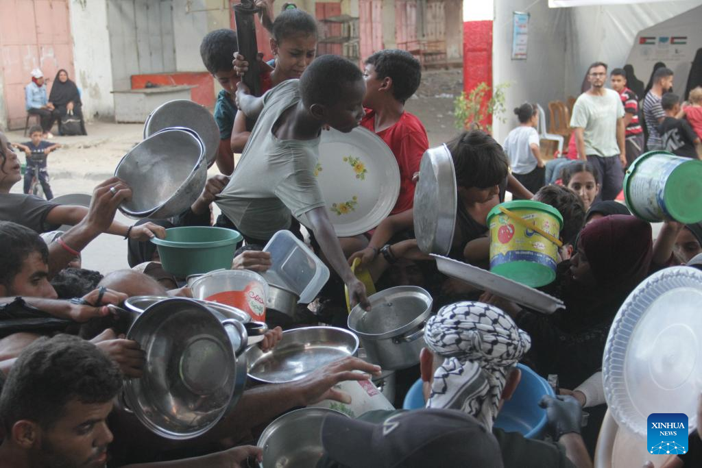 People try to get food relief in Jabalia refugee camp, northern Gaza Strip, on Aug. 29, 2024. Gaza is now in the grip of a severe humanitarian crisis, with millions displaced and necessities such as food, medicine and clean water in critical shortage. In July, UN experts warned that famine has spread throughout the Gaza Strip. (Photo by Mahmoud Zaki/Xinhua)