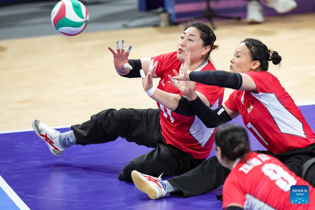 Zhang Lijun (L) and Wang Yanan of China defend during the sitting volleyball women's preliminaries Pool A match between China and the United States at the Paris 2024 Paralympic Games in Paris, Aug. 30, 2024. (Xinhua/Zhang Cheng)