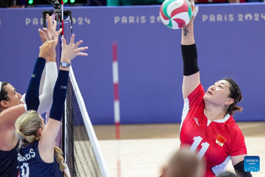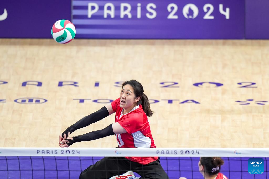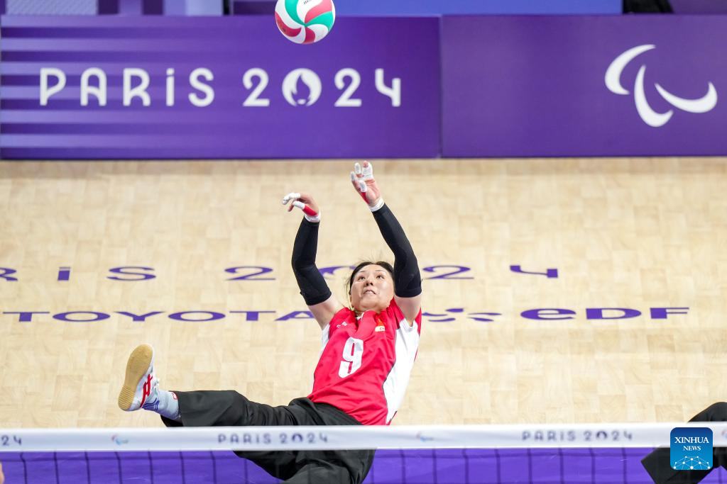 Zhang Lijun (R) of China spikes the ball during the sitting volleyball women's preliminaries Pool A match between China and the United States at the Paris 2024 Paralympic Games in Paris, Aug. 30, 2024. (Xinhua/Zhang Cheng)