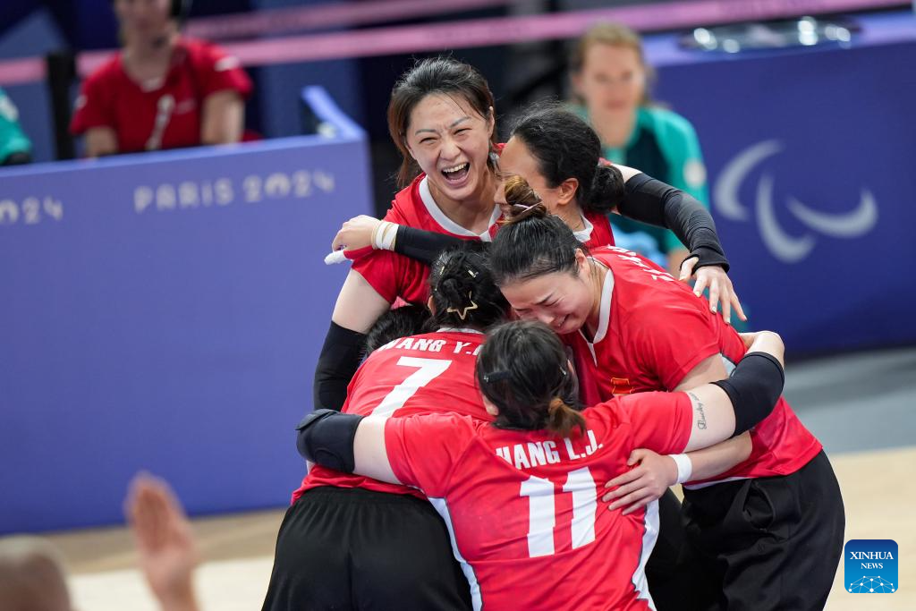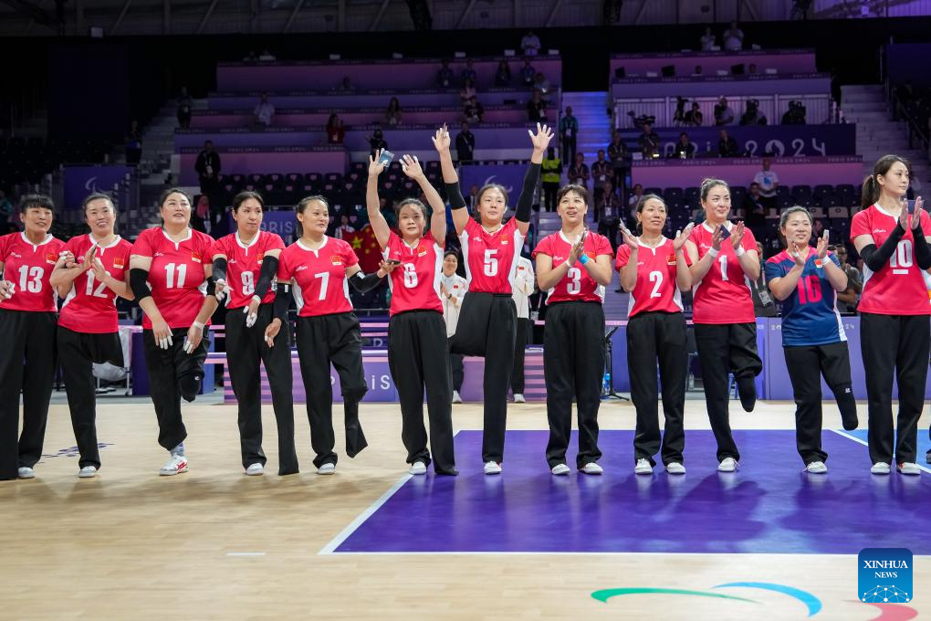 Players of China celebrate after winning the sitting volleyball women's preliminaries Pool A match between China and the United States at the Paris 2024 Paralympic Games in Paris, Aug. 30, 2024. (Xinhua/Zhang Cheng)