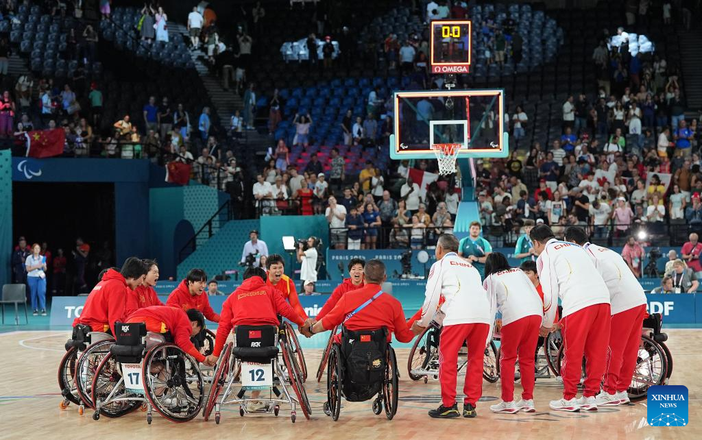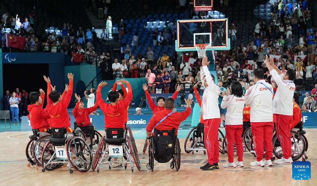 Members of team China celebrate after the wheelchair basketball women's preliminary round Group A match between Canada and China at the Paris 2024 Paralympic Games in Paris, France, Aug. 29, 2024. (Xinhua/Gao Jing)