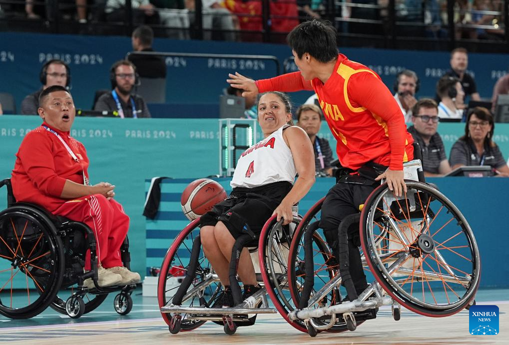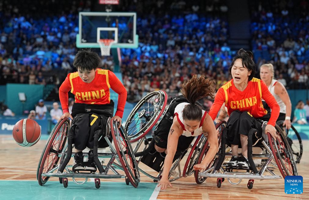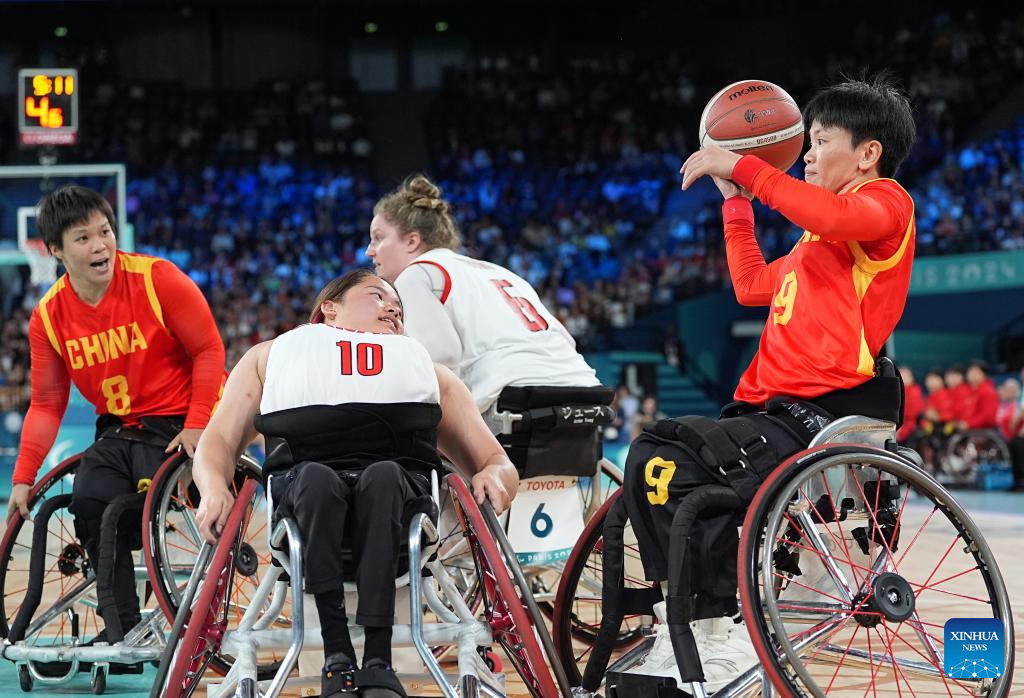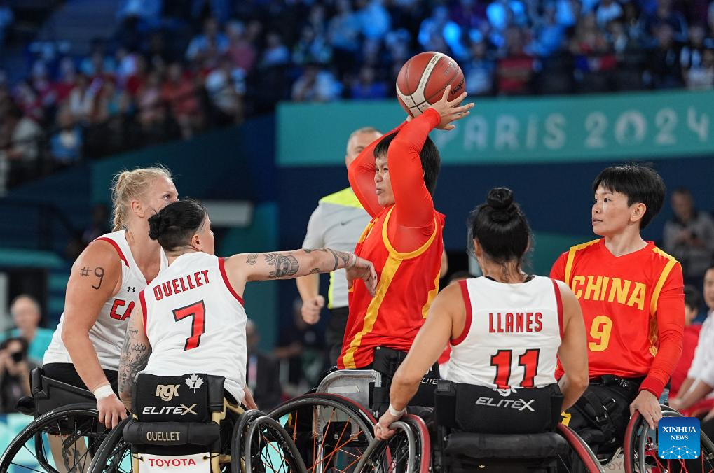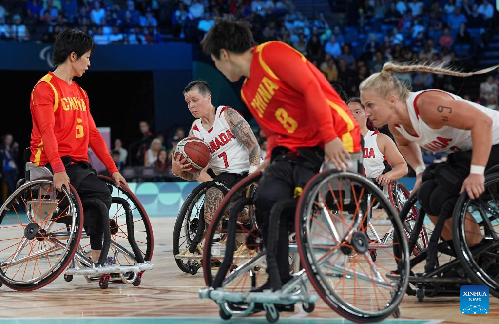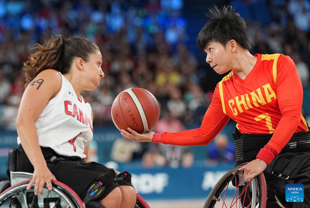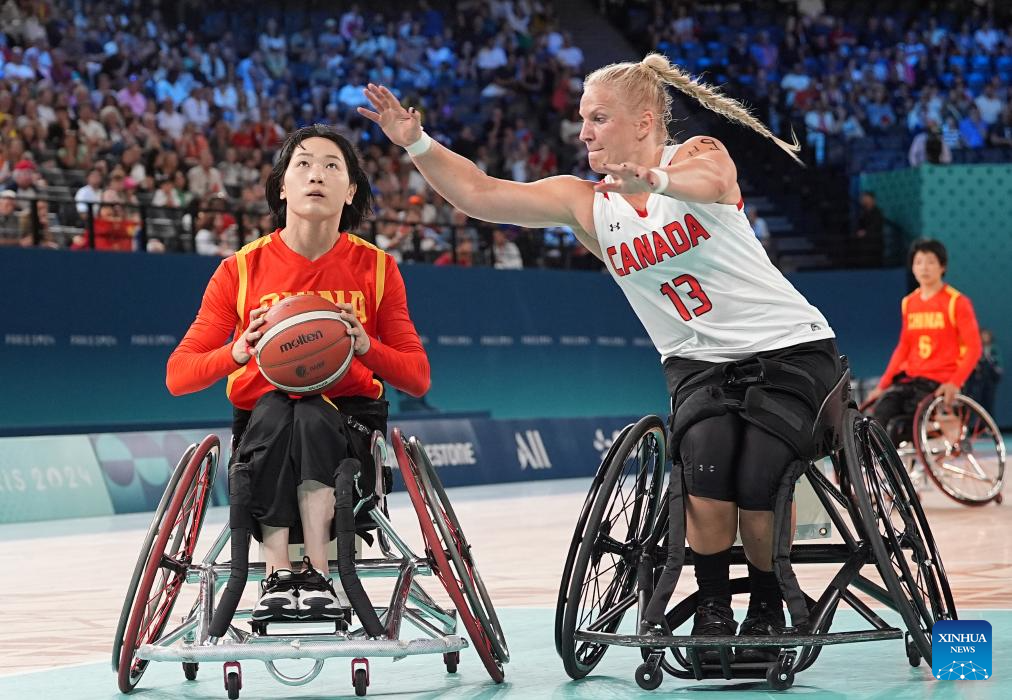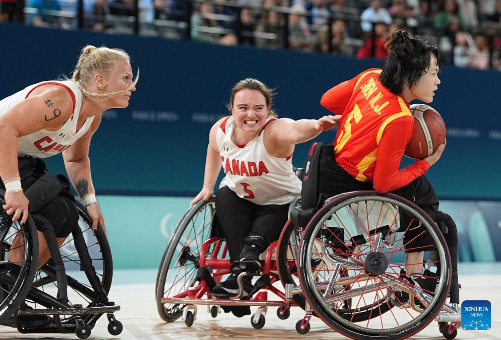 Lyu Guidi (R) of China vies with Rosalie Lalonde (C) of Canada during the wheelchair basketball women's preliminary round Group A match between Canada and China at the Paris 2024 Paralympic Games in Paris, France, Aug. 29, 2024. (Xinhua/Gao Jing)